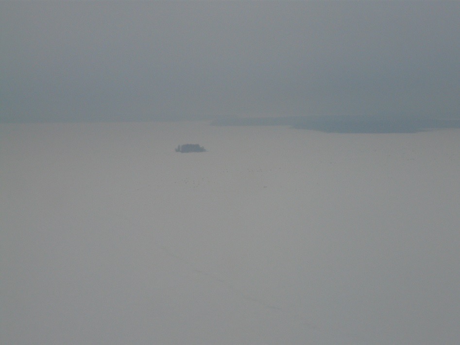 ) поближе к рыбакам, ведь там должна быть рыба, но побоялся за толщину льда и побоялся сдуть рыбацкие палатки. Нашёл косу и сел.