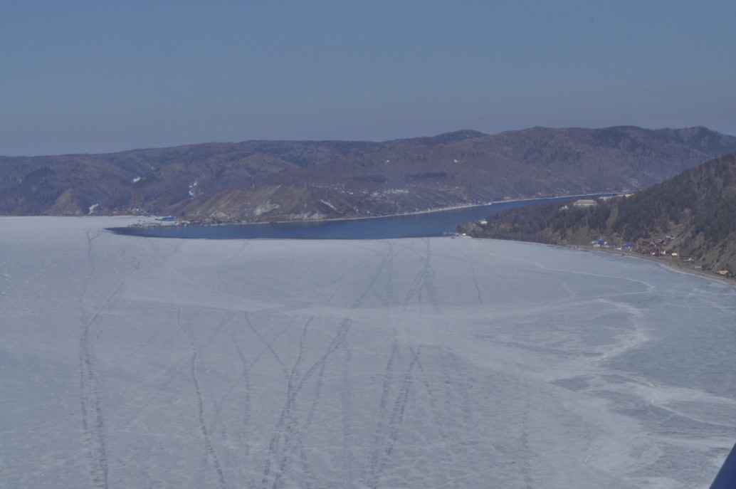 На фотографии видны следы как от гусениц на льду, это следы многочисленные суден на воздушной подушке. Весной в апреле когда уже нельзя ездить по льду это основной транспорт близлежащих деревень.