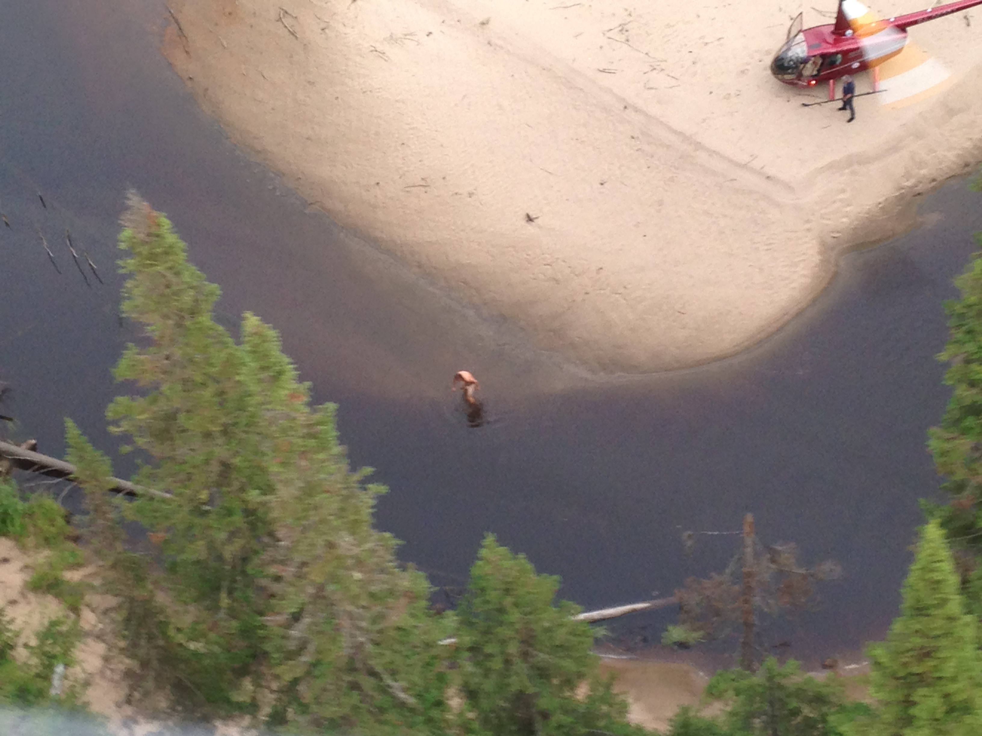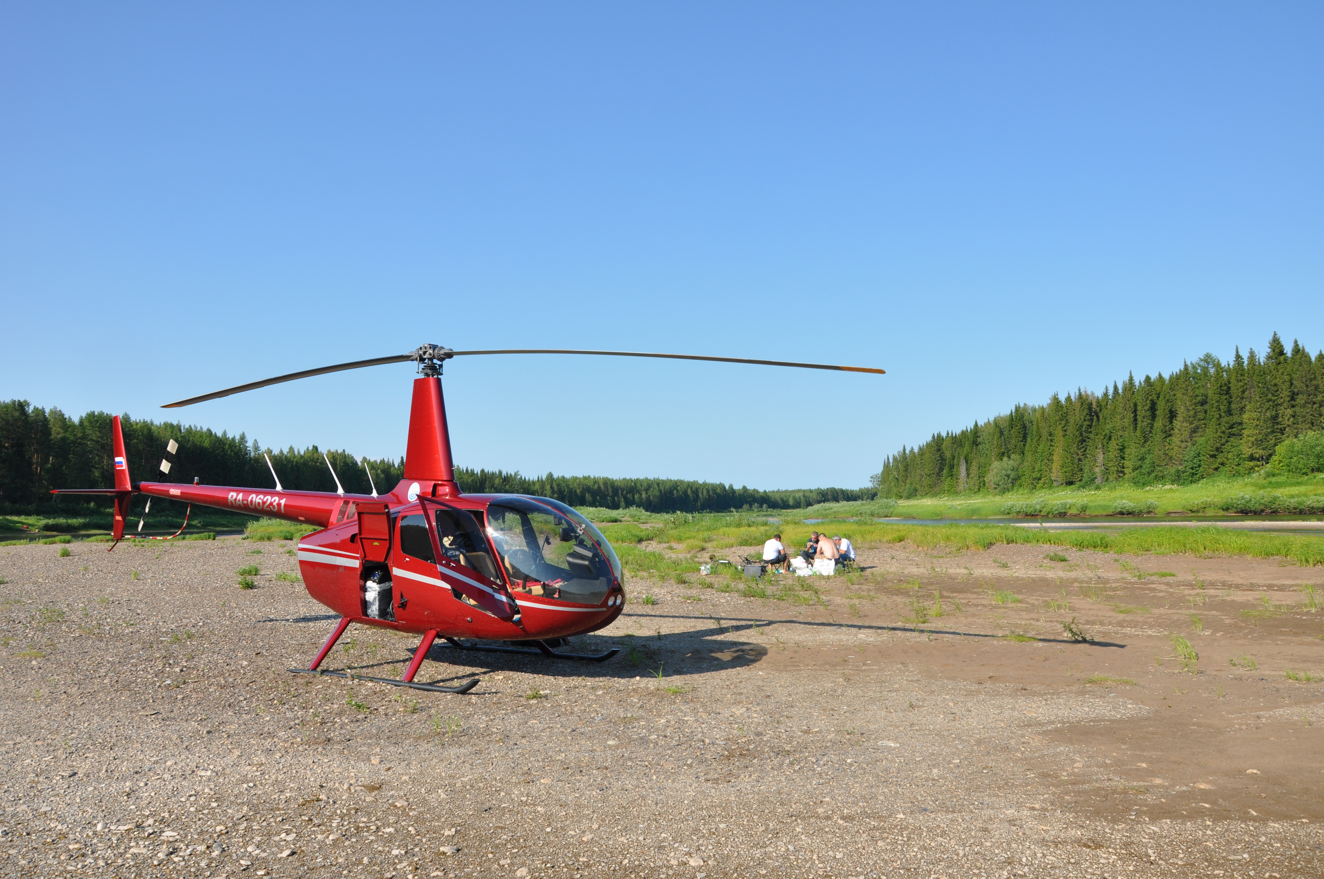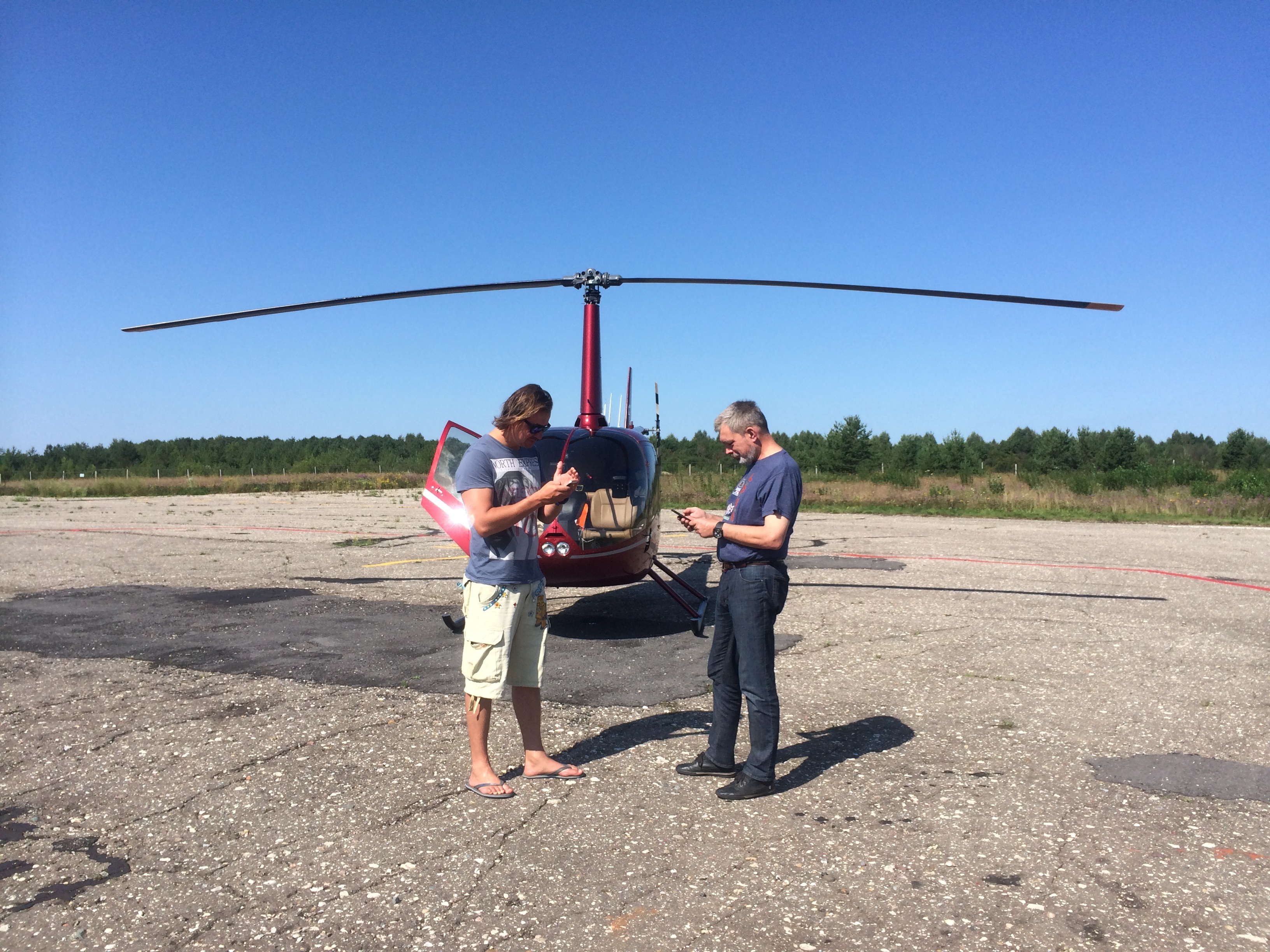 из местных первым прибежал мокрый холеный черный пес с кожаным ошейником ... он похоже не знал куда деваться от комарих и от жары ... и даже пытался спрятаться под вертолетом ... чуть позже подошедшие дачники пояснили, что пес привык к ваннам с шампунем и просто еще не пообвыкся ... общение с местными было недолгим ... показав, все более рекордный результат в перекачке топлива из доп бака в основной, мы, примерно в 12:10, совершив круг почета, выдвинулись дальше ... :D
