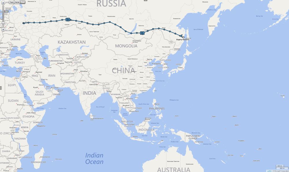 Монстры, едрёныть! Надеюсь, дальше полегче будет - темп пониже, часовые пояса не так будут мелькать... А вот именно таким темпом, если смотреть на карту, кажется - за месяц можно весь маршрут пройти :-)