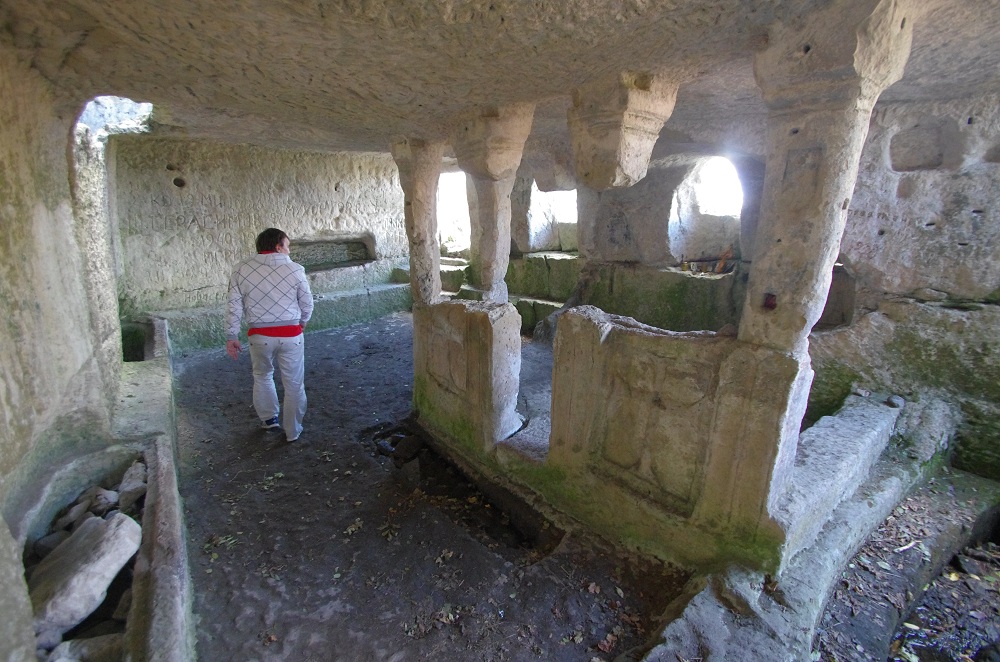 Тепе-Кермен храм, вырубленный в скале Во время прокатки увидели на Тепе-Кермен работу неизвестных художников. Родилась небольшая акция, закрасить скалу в цвет скалы. Краску приготовили. Без журналистов ни куда ))) Официальный спонсор мероприятия ООО "Цветы Юга" - одна из крупнейших цветочных фирм на юге России Сюжет аргументов недели Крым. Джипы перед ралли прошли испытания под Бахчисараем