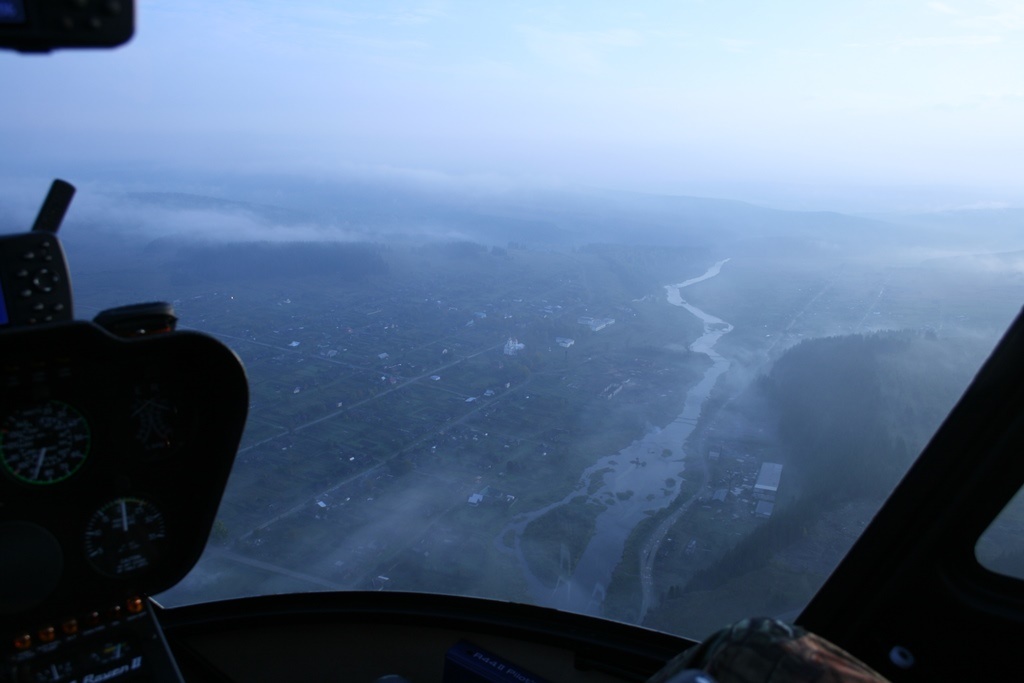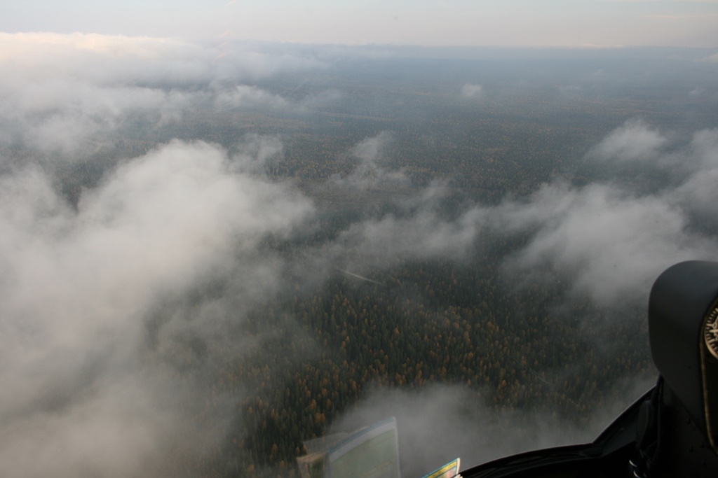 А туман тем временем крепчает и поднимается, но изучение прогнозов на точке продолжает вселять уверенность в наши сердца, хотя уже не так явно. Запас по топливу позволяет нам вернутся в точку вылета с любой точки маршрута, опрос домашних успокаивает - у них погода звенит, бабье лето, золотая осень!