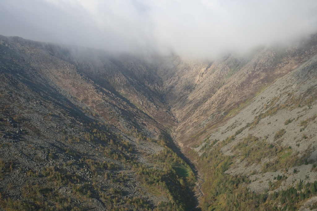 Вид на Иовский провал, над ним высокогорное плато, куда мы и планировали присесть, высота около 1200 метров, но к сожалению облака не дают нам этого сделать. Непосредственно за ним располагается вершина Конжака, так его в простонародности у нас кличут.