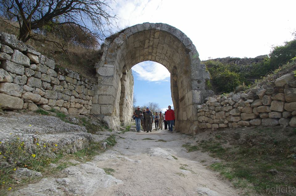 Экскурсия в Чуфут-Кале, прошли улочками древнего города, древними тротуарами из каменных плит, посмотрели погреба зажиточного караима, мавзолей Джаныке-ханым, хозяйственные пещеры.