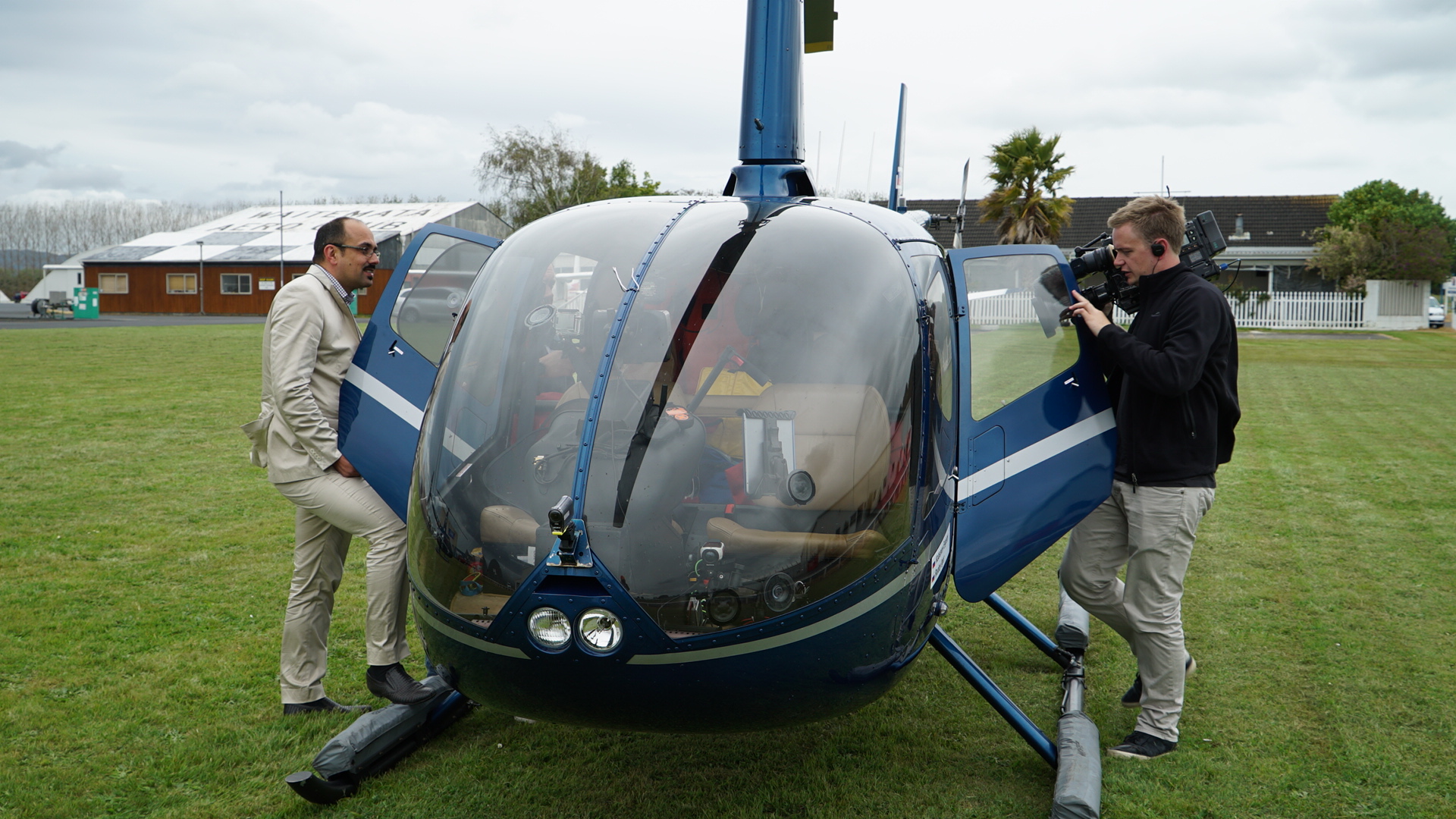 В плотном строю ангаров, стоящих с южной стороны вдоль полосы надо было найти ангар Wanaka Helicopters (дальше буду писать WH), на что ушло некоторое количество сил и времени, тк вывески там у всех не очень большие. Пока мы заруливали, какой-то человек вышел из домика-офиса WH и показал нам место посадки на траве прямо напротив домика. Вокруг были одни вертолетные названия - Alpine Helicopters, Tailwind, Glacier Aviation и много разных вертолетов. Нас встретил Питер, с которым мы переписывались накануне, сказал, что скоро прилетит Саймон, и ушел. Вскоре прилетел на R22 Саймон (тот самый знаменитый Simon Spencer-Bower), это он приветствовал нас в эфире, потащил в домик, потом опять наружу, потом прибежала толпа человек из 10 с пивом в руках - кто-то из новоиспеченных летчиков получил PPL, начинали отмечать. Мы вновь рассказывали, как преодолели океан, показывали баки, обсуждали наши возможности беспосадочного полета и тд.