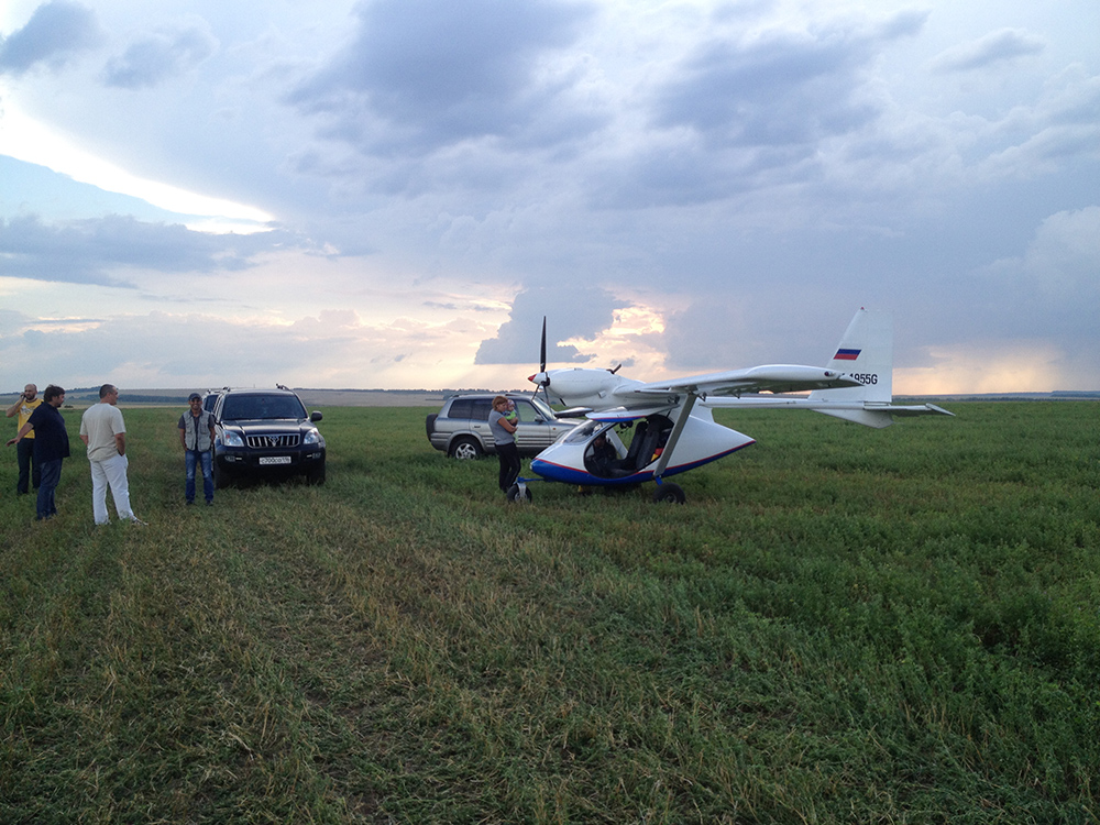 Гроза серьезная идет. Причем прямо сейчас. Поднимаем глаза на горизонт - мрак! Завтра мы не вылетим. Что делать? Александр начал звонить своим знакомым в Казани, которые были готовы принять нас на ночлег в районе п. Сюкеево, аэродрома там нет и он попросил их машинами в более или менее ровном поле накатать нам полосу для посадки и скинуть ее координаты по СМС. Уже весело!