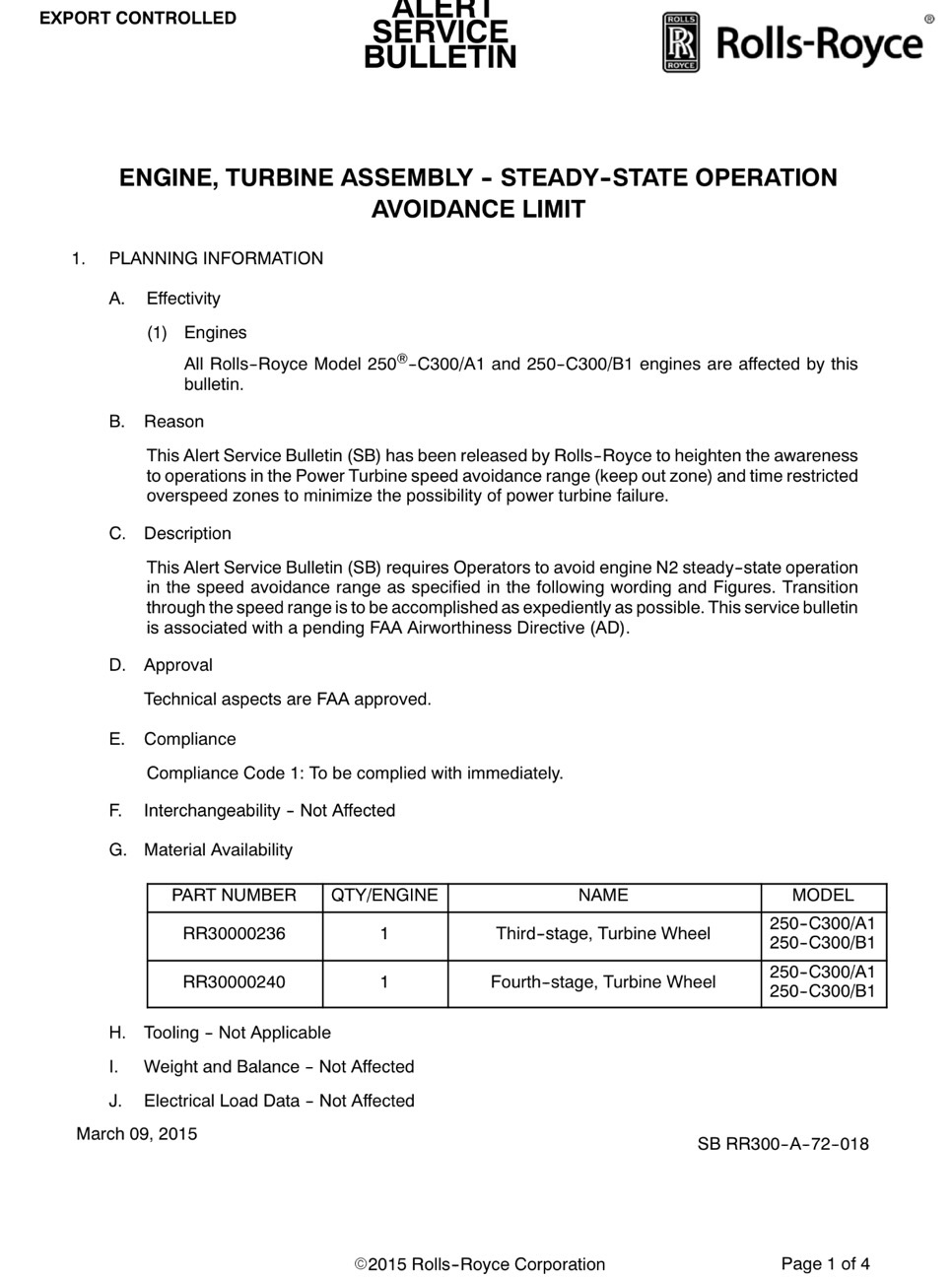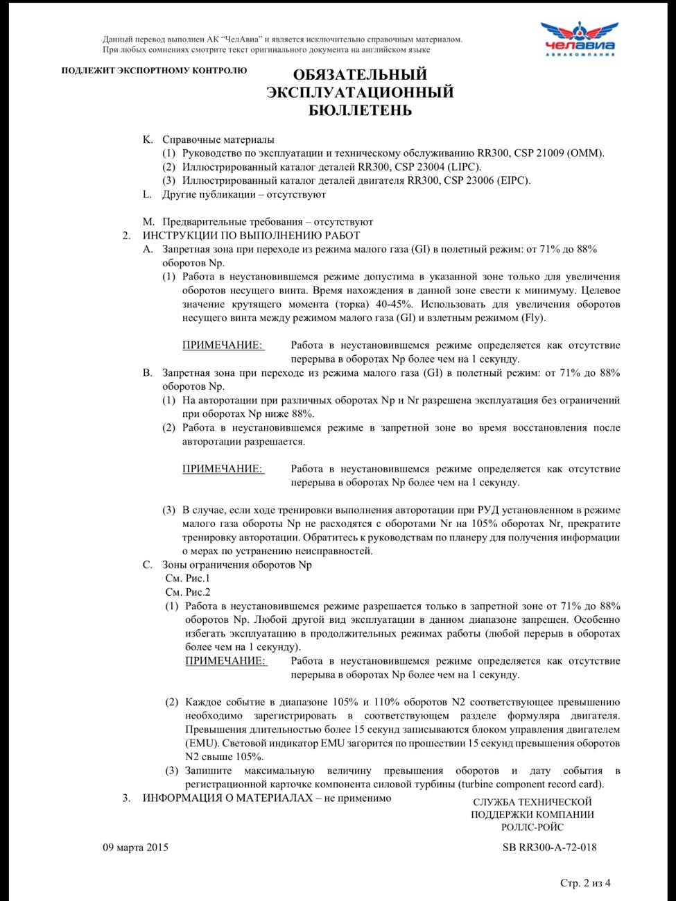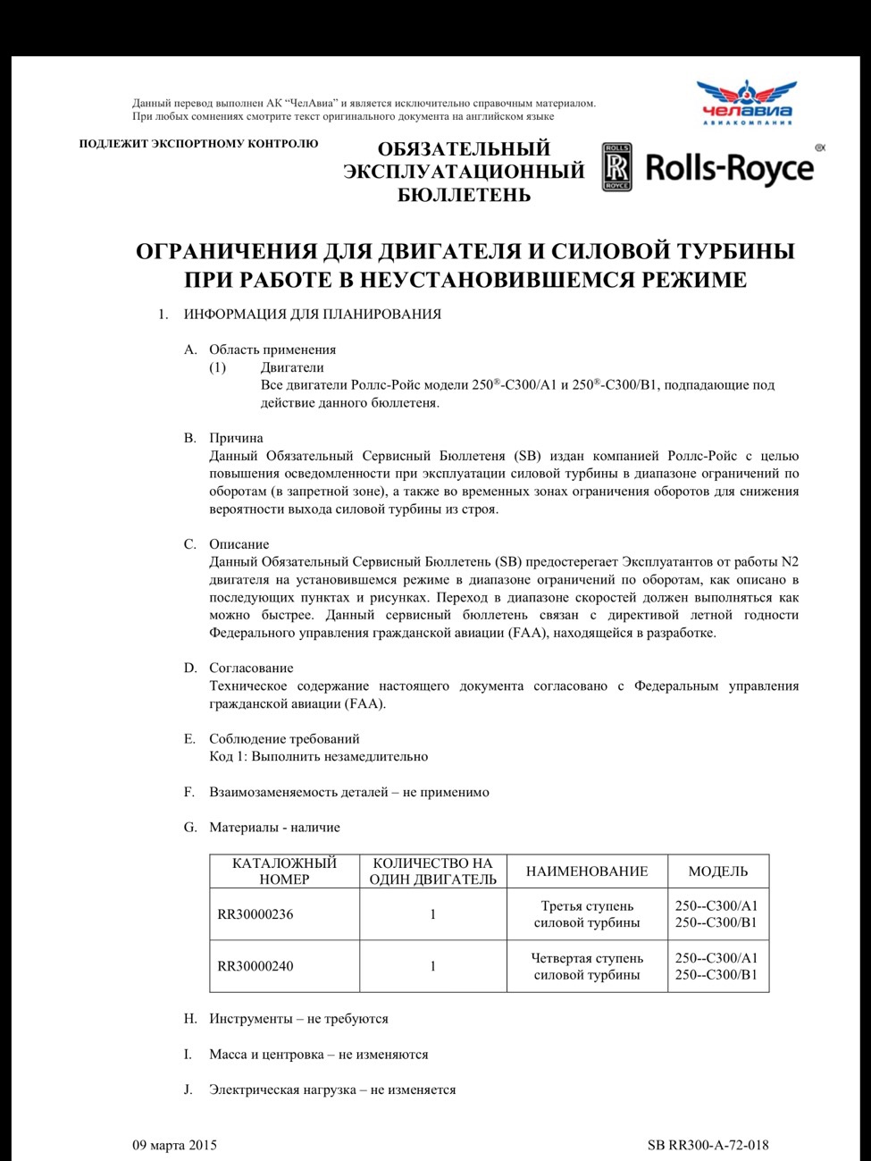 Перевод обязательного эксплутационного бюллетеня SB RR300-A-72-018