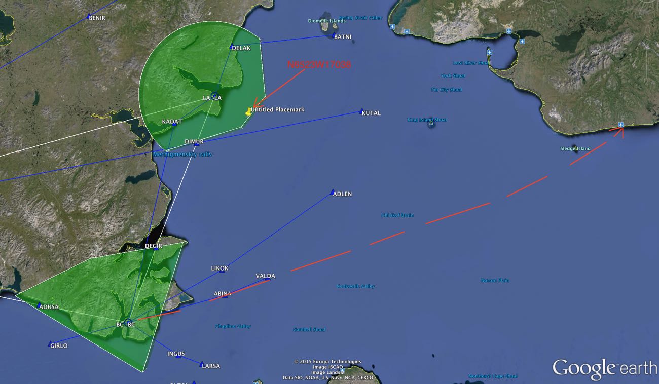 Ну так посмотри на второй картинке, где Провидения, где VALDA и где точка с твоими координатами (желтая булавка)Roger22 писал(а):Там вариантов то всего 2: через ADLEN и через VALDA. Я в плане поставил вторую. И выполнил в точности. После границы, уже американская точка YUREE, по-моему. Почему вопрос?