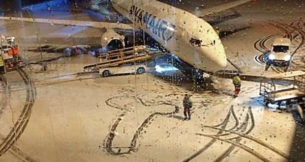 Оригинал:В то время когда наш персонал на земле преуспевает в своих прямых обязанностях, очевидно, рисование не является их коньком. В этом примере ясно видно, что на снегу была попытка нарисовать самолет, но были совершенно упущены крылья.