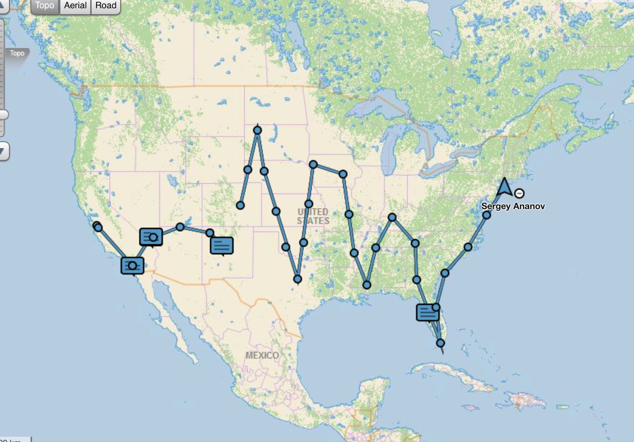 Сначала через наши сибирские юга, потом Якутия, Чукотка, дальше Аляска, запад Штатов, потом через всякие Кордильеры, пустыни, каньоны - во Флориду. В июле там хорошо-о-о, наверное, в кабинке 22-го будет! Дальше севернее в Канаду, через Гренландию-Исландию-Фореры в Европу. И опять дома ...