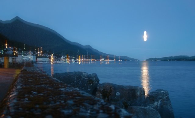 Это была табличка при входе на паром. Паром перевёз нас за $6 на другую сторону речки (аэропорт и городок по разные стороны воды) и мы поехали в гостиницу. Суровость Аляски мы сразу ощутили на себе - вместо калифорнийских $60-80 за номер здесь пришлось отдать сразу $165. Как потом оказалось - это стандартная цена за номер в аляскинской гостинице, невзирая на её "звёздность". Потом выбрались поесть - достопримечательностями городок не блистал.