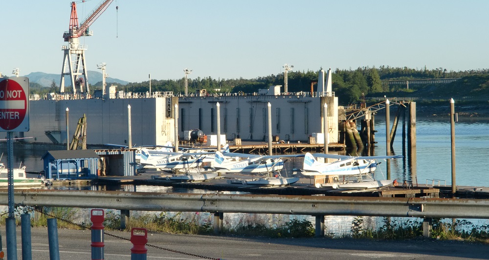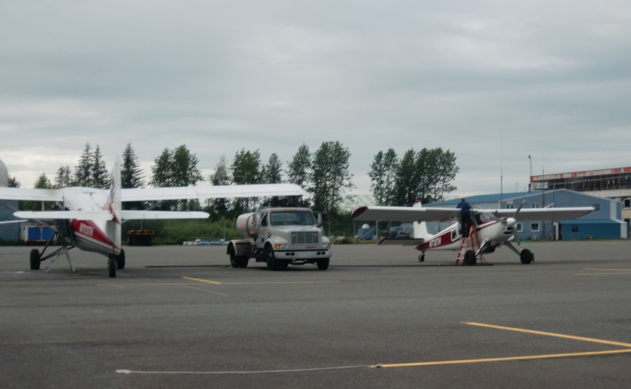 Интересно, что Кетчикан оказался единственным аэропортом, где у меня спросили пропуск. Там зона "нормального" аэропорта отделена от раздолбайской GA по периметру простой желтой линией. А мусорные контейнеры как раз находятся внутри неё. Решив от безделья убраться в самолёте, я собрал весь мусор и пустые банки из-под масла, и отправился туда выбрасывать. А на обратном пути был остановлен грозным дядькой в желтой жилетке, перепоясанным цветоотражающими лентами, с требованием предъявить "бэйдж". Вынутая из кармана карточка РАОПы и кивок на наш раритетный агрегат его вполне удовлетворил. Да здравствует РАОПА!