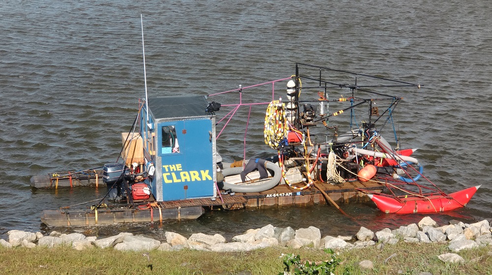 Вид на кусочек порта. По берегу пришвартованы частные мини-драги для промывки золотоносного песка.