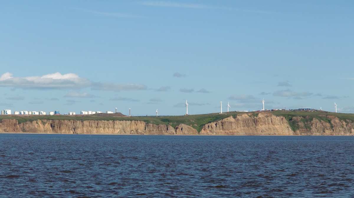 На противоположном берегу - терминал "Сибнефти" и ветряки, построенные при Абрамовиче. Лопасти с них правда пооблетели - ветра здесь бывают нешуточные.