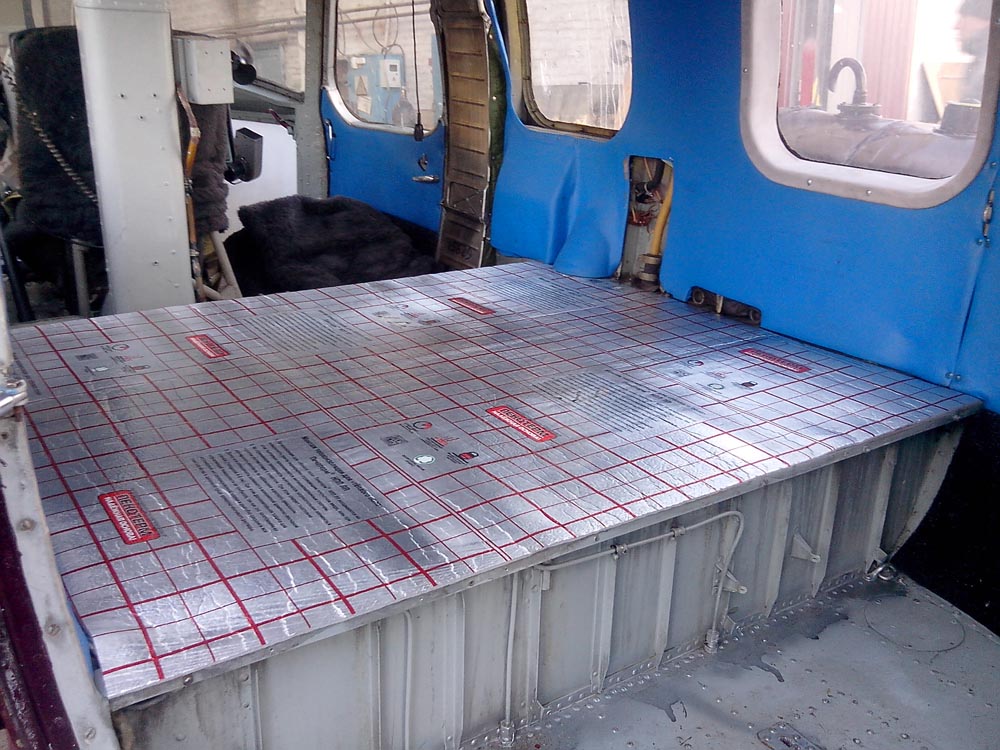 После установки застилаем ковролином, можно застилать кожей, винилом, линолеумом эффект от этого только увеличивается за счёт нагрева покрытия, хотя основной эффект обогрева осуществляется путём нагрева окружающих предметов под действием инфракрасного излучения специально подобранного спектра приближенного к солнечному. Вообще когда залазишь в вертолёт чувствуешь тепло, даже не знаю как описать точно это чувство.