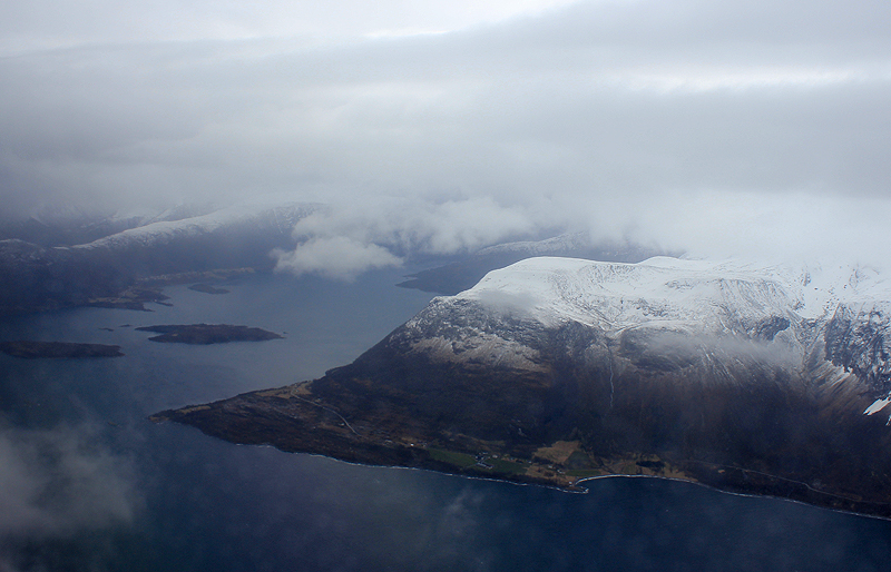 Дракоша встал на эшелон и взял курс на Норвегию, город Alesund, аэродром Vigra - ENAL. Мы большей частью молчали - каждый о своем. Часа через полтора внизу появились предгорья, а вместе с ними и плотный слой облаков. Земля исчезла. Пики гор - темно-серые монументы, украшенные ожерельями из снега - мы ловили их, тщательно прицеливаясь объективом в редкие разрывы облаков.