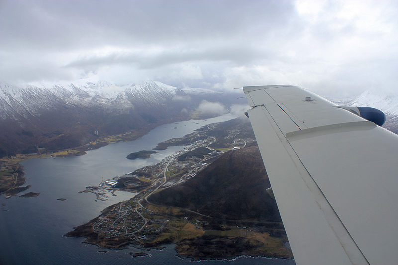 Еще через полчаса начали снижение. Заходили по ILS, полоса 25. Экипаж ощутимо напрягся: облака были неприятные, ледяные. Автоматический информатор ATIS давал температуру у земли +3С, рваный ветер и нижний край облачности 500 футов, при том, что это фьорды, пики гор достигают 3000 футов, и они в облаках. Мы, помятуя, как на Ацтеке ловили лед в +8С, внимательно следили за лобиками крыльев. Реальность оказалась намного приятнее ожиданий. Нас отвекторили, из облаков вынырнули где-то на 800 футах, льда налипло немного и он быстро стаял. А когда открылась земля, я аж подпрыгнула в кресле - я еще не видела гор из самолета так близко – почти за законцовкой крыла, только руку протяни!