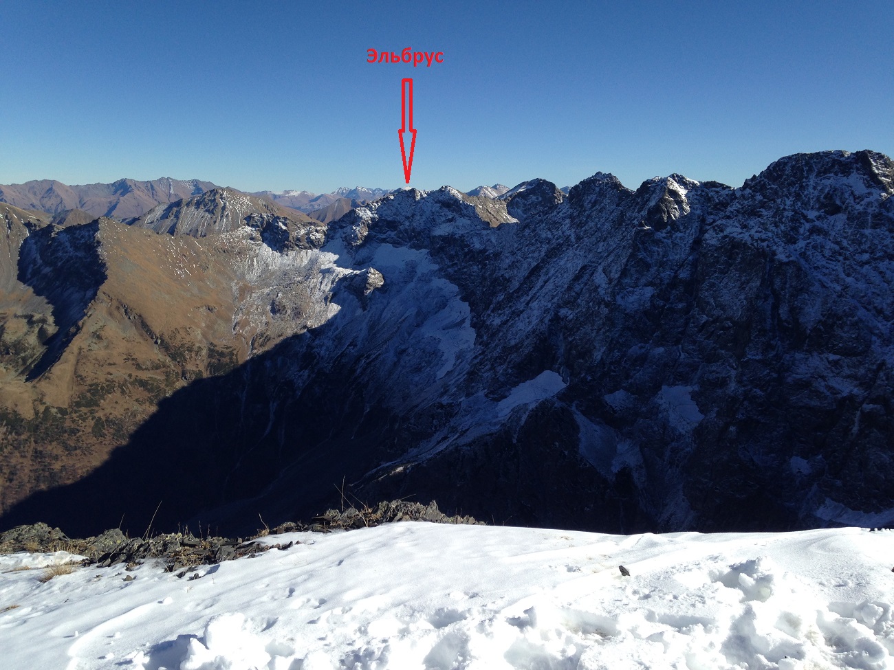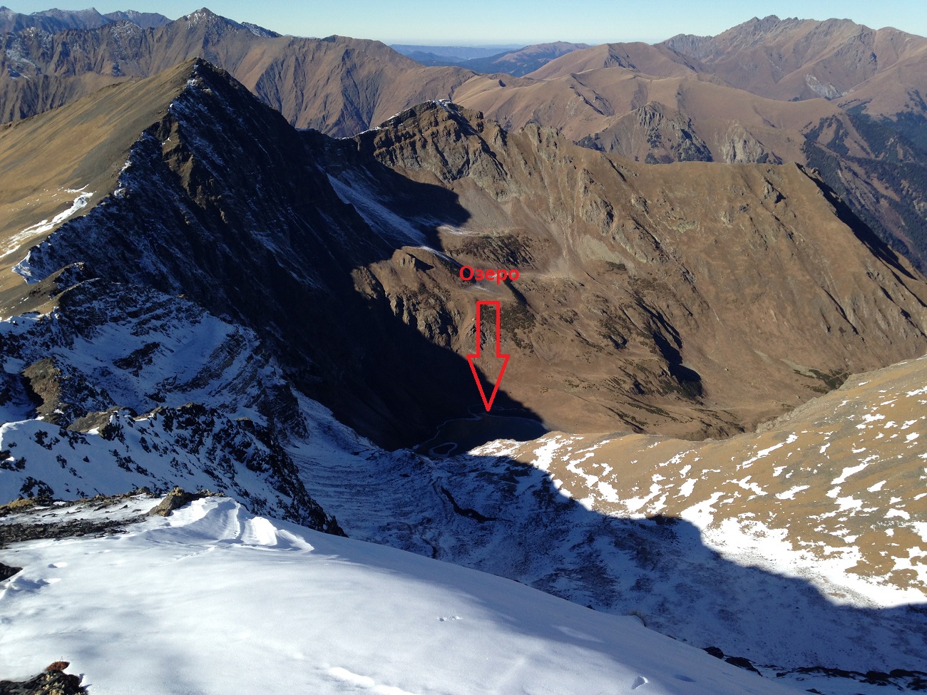 С другой - скальные гребни Тхачей! Весь Кавказский хребет! В ущелье внизу - начинающее с краев замерзать еще озеро - нереальное зрелище!