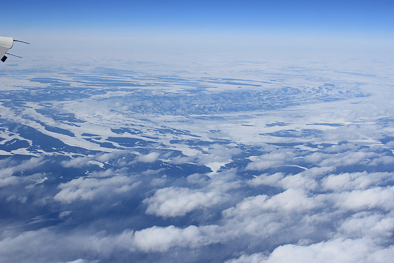 Через полчаса Гренландия закрылась плотным слоем облаков. Даже как-то скучновато. В первый момент всегда впечатляешься белой пушистой перине, а через некоторое время взгляд привыкает и начинает искать, за что бы ему зацепиться. Это как с едою – если два дня подряд кушать только пирожные, на третий день душа начинает просить сосиску с хреном. Кстати, сосиска была бы очень хороша, даже две, или три. Кофе от щедрот АДП давно усвоился организмом, котлетный бюджет мы освоили еще в начале полета и к середине пути утешались морковочками, припасенными еще в Таллине, с осознанием того, что обеда не предвидится. На второй трети пути облака открыли нам океан.
