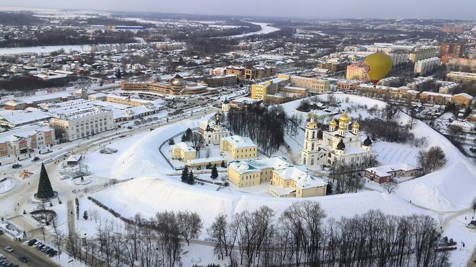 Ваня нам хотел продемонстрировать свой фокус с посадкой на центральной городской площади около елочки (вот на фото она слева), но прошли правее и поэтому полетели дальше мимо Дмитровского кремля (то что валом окружено). Но сам факт что шар можно подобно вертолету воткнуть на городской площади это впечатляет.