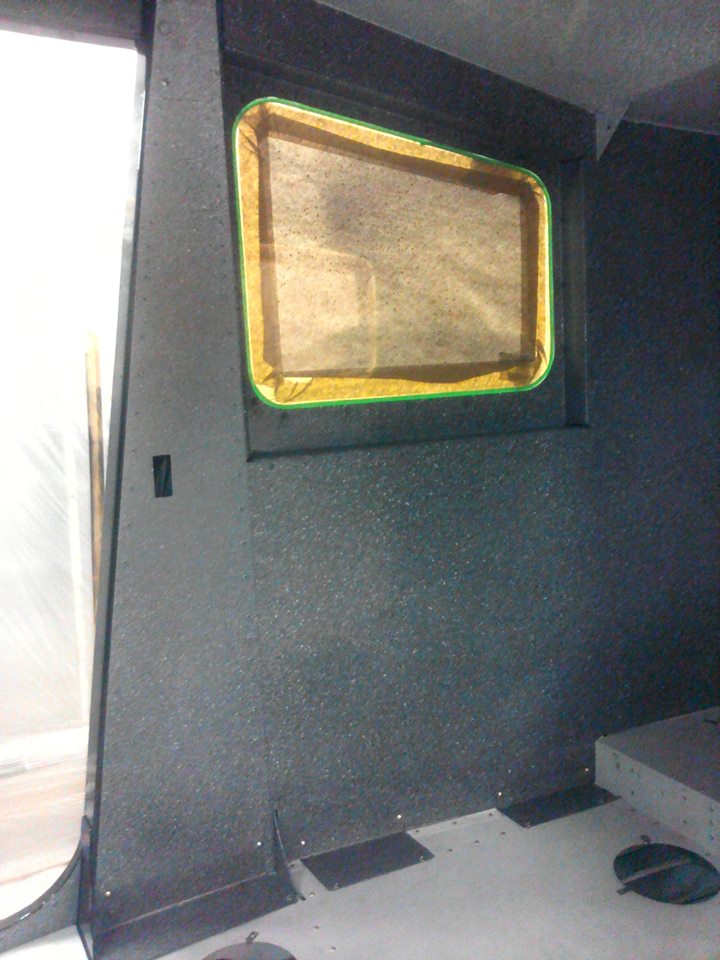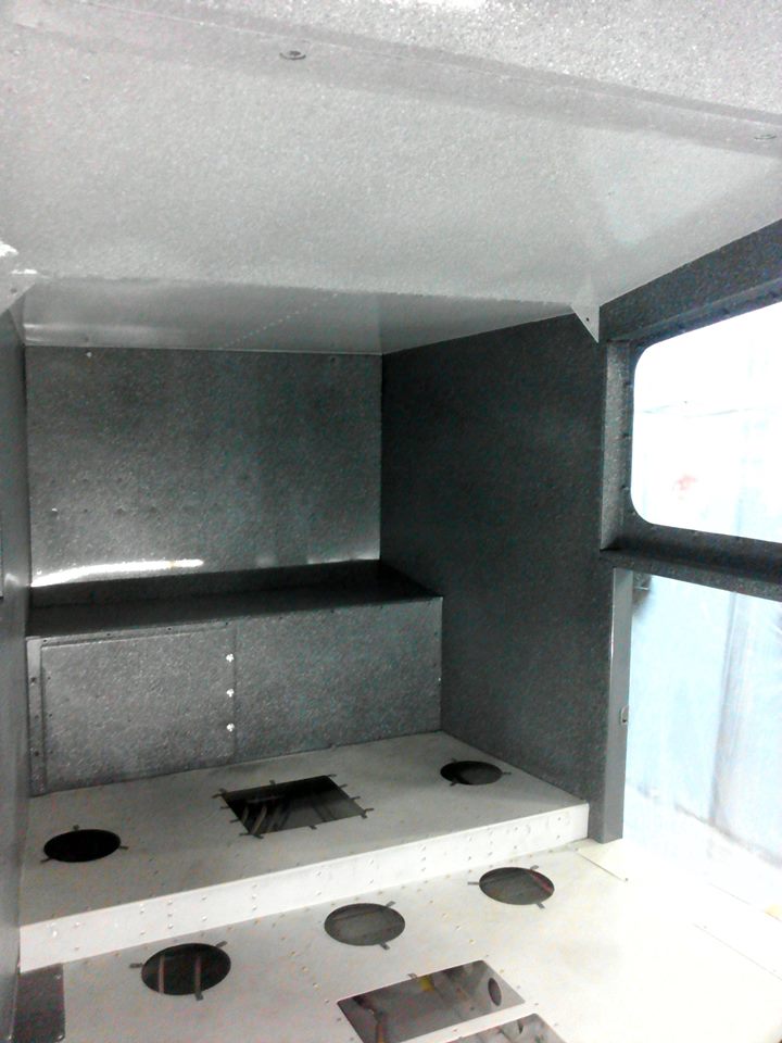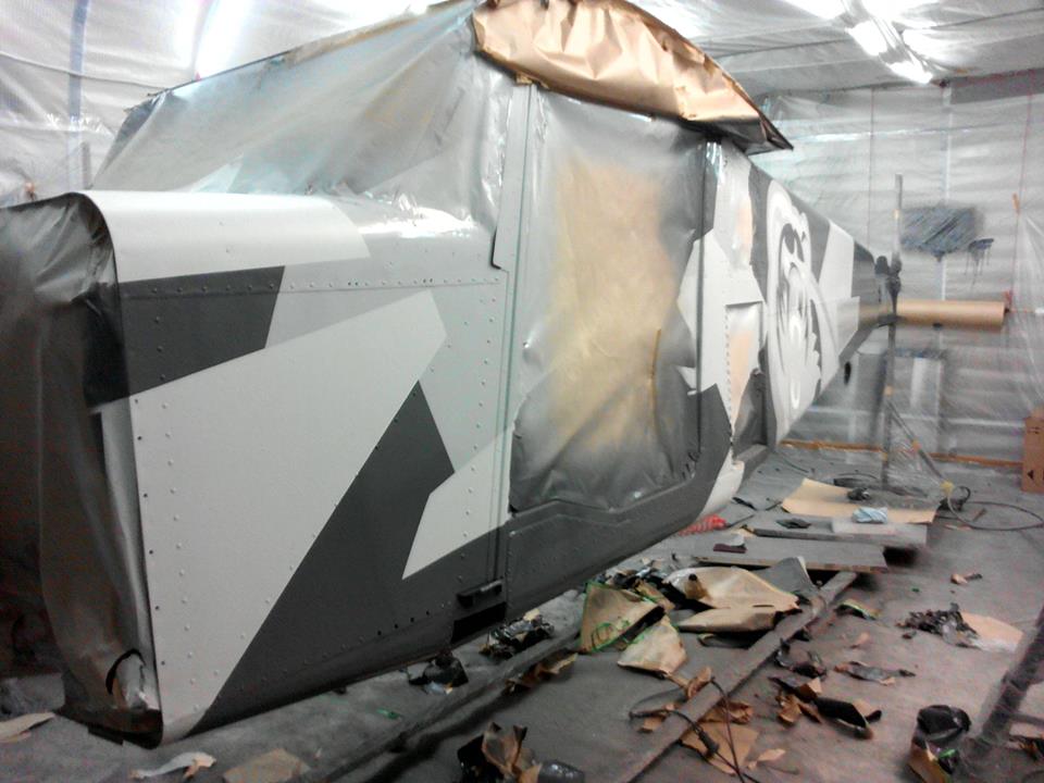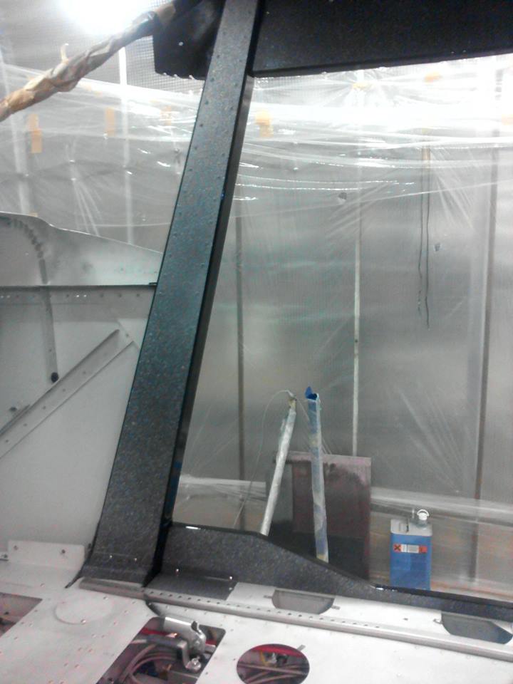 Начал красить с кокпита. Поскольку заказчик отказался от всяческого рода панелей и обшивок, а просто окрашенная кабина, на мой взгляд, выглядела-бы, эдак тракторно танковой по дизайну, со всеми заклепками и винтами внутри, выбрал такой вот метод набрызга. Получилось весьма монументально. Гранит, ёпта. Прям как в московском метро.