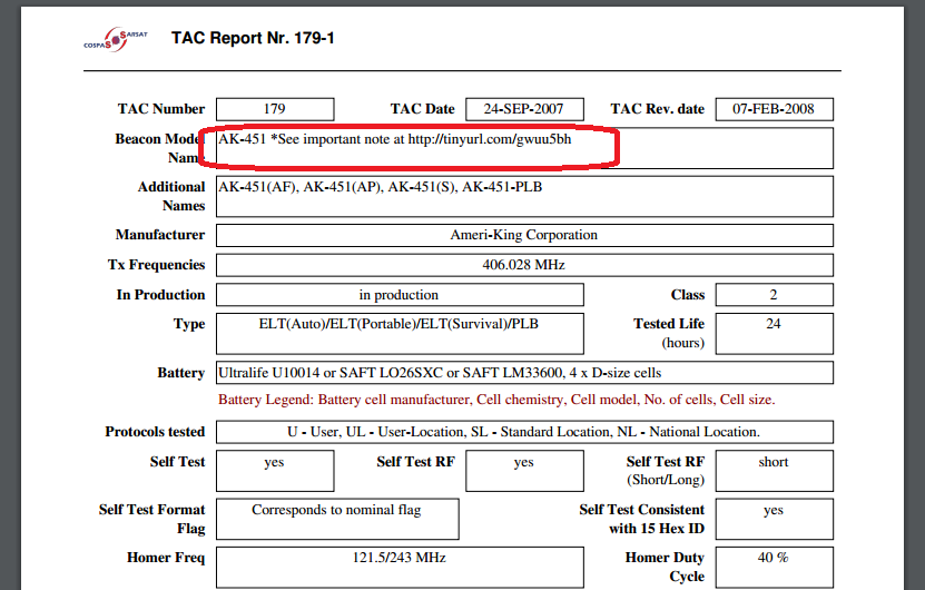 До получения официальной информации секретариата КОСПАС-САРСАТ по модели Ameri King АК-451,