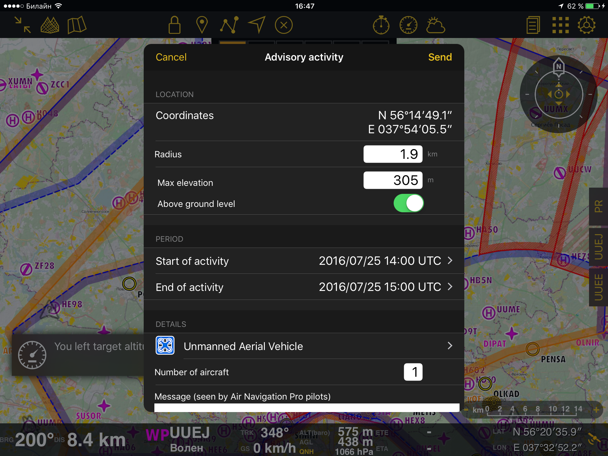 Advisory Activity - пока даже не знаю, как точно перевести по-смыслу. Наверное "неопубликованная активность", хотя по-русски слишком длинно. Но суть в том, что каждый пользователь, который имеет учетную запись и интернет, может опубликовать информацию, которая появится на картах у всех остальных пользователей, имеющих он-лайн подключение. К примеру, в районе площадки Конаково в классе G проводятся спортивные мероприятия без установления местного режима. Кто-нибудь из пользователей делает такое уведомление в течение минуты, и оно появляется у всех пользователей на экранах в виде синего значка с окружностью, радиус которой вы устанавливаете в настройках Также указывается и время активности. Тот, кто установил зону, может ее и удалить. По-моему удобно, но надо еще привыкать.