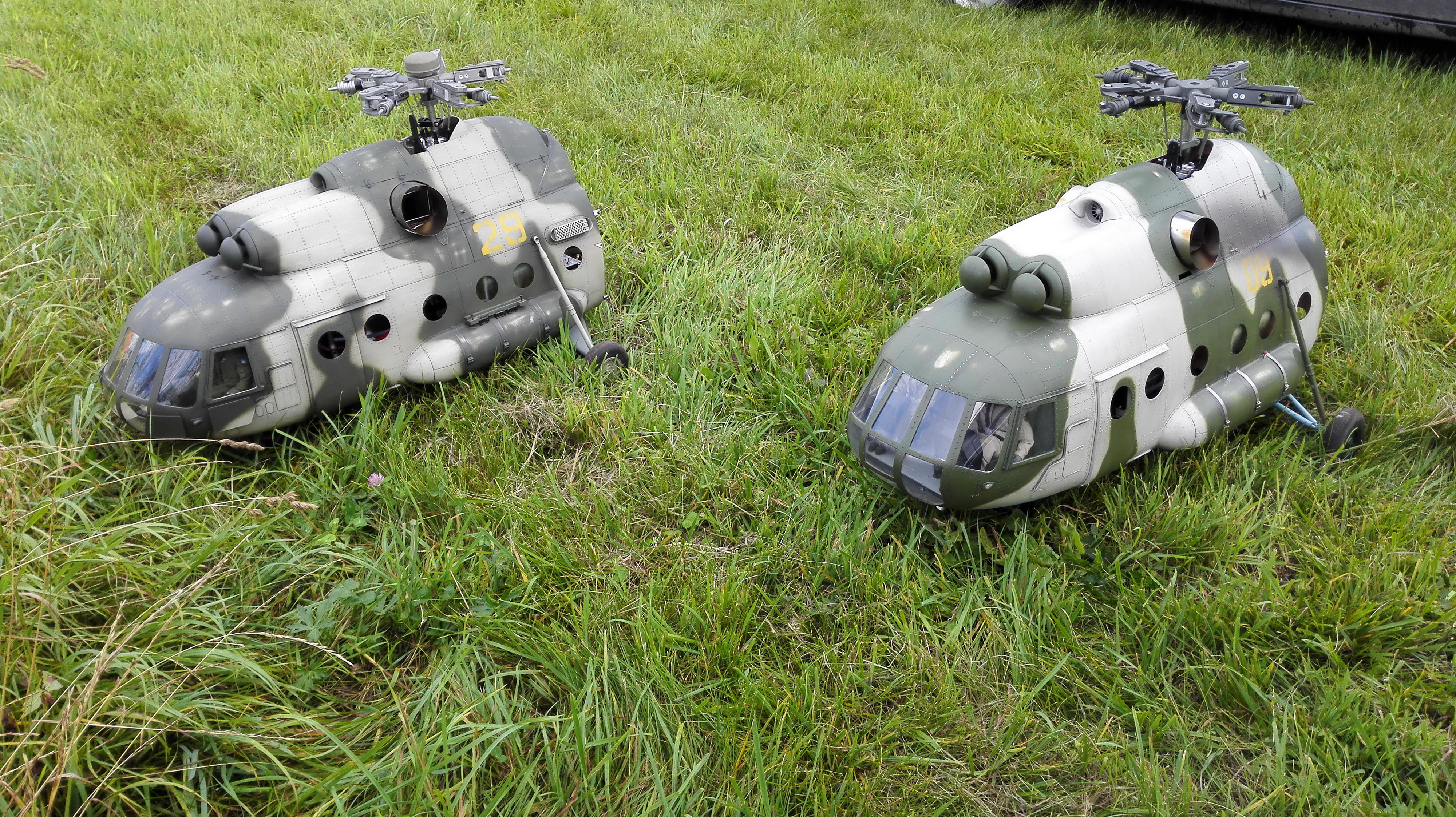 Пара Ми-8 под прикрытием Ми-24 атакует базу боевиков и "высаживает десант". Копии абсолютные. Двигатели газотурбинные, топливо у моделей ТС-1.