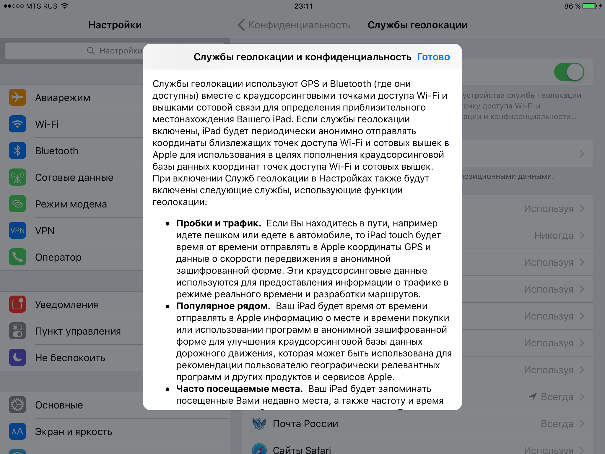 Вопрос конечно спорный, ибо статус сигнала от встроенных датчиков наглядно не отображается, а поддержка Глонасс по опять же непроверенным слухам, заявлена только для того, чтобы избежать налогов при продаже устройств в России еще со времен iphone 4s http://appleinsider.ru/iphone/iphone-4s ... onass.html По факту же имея на борту штатный приемник Глонасс СН-4312, который отлично ловит Российские спутники, iPad, лежащий в блистере зачастую теряет позиционирование напрочь. Да и в самом устройстве в заявлении о конфиденциальности слово GLONASS® не встречается нигде.. И потом, как я писал выше, мне свойственна здоровая паранойяvovatuner писал(а):Дык еще с третьего айпада Глонасс поддерживается... вроде бы...dd8bb писал(а):приемник сигналов позиционирования от отечественных спутников.. Возможно это паранойя,