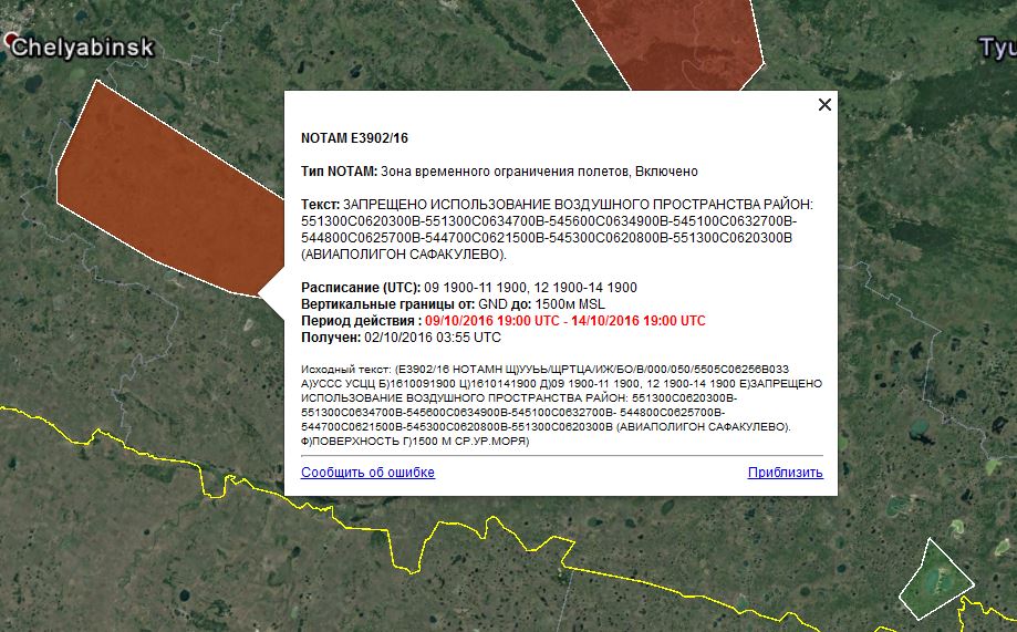 <description><![CDATA[<b>Тип NOTAM:</b> Зона временного ограничения полетов, Включено<br><br><b>Текст:</b> ЗАПРЕЩЕНО ИСПОЛЬЗОВАНИЕ ВОЗДУШНОГО ПРОСТРАНСТВА РАЙОН: 551300С0620300В-551300С0634700В-545600С0634900В-545100С0632700В- 544800С0625700В-544700С0621500В-545300С0620800В-551300С0620300В (АВИАПОЛИГОН САФАКУЛЕВО).<br><br><b>Расписание (UTC):</b> 09 1900-11 1900, 12 1900-14 1900<br><b>Вертикальные границы от:</b> GND <b>до:</b> 1500м MSL<br><b>Период действия : <font color=red>09/10/2016 19:00 UTC - 14/10/2016 19:00 UTC</font></b><br><b>Получен:</b> 04/10/2016 06:55 UTC<br><br><font size=-1>Исходный текст: $[rawnotam]</font>]]></description>