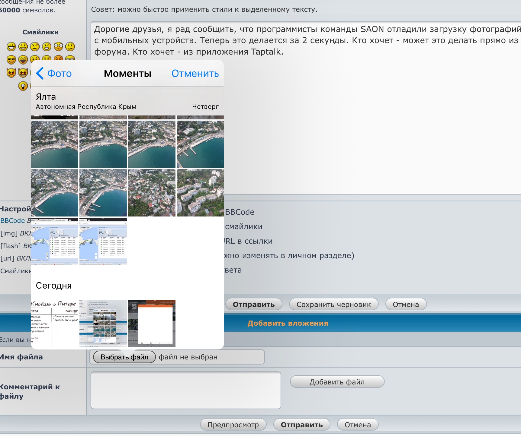 Дорогие друзья, я рад сообщить, что программисты команды SAON отладили загрузку фотографий с мобильных устройств. Теперь это делается за 2 секунды. Кто хочет - может это делать прямо из форума. Кто хочет - из приложения Taptalk.