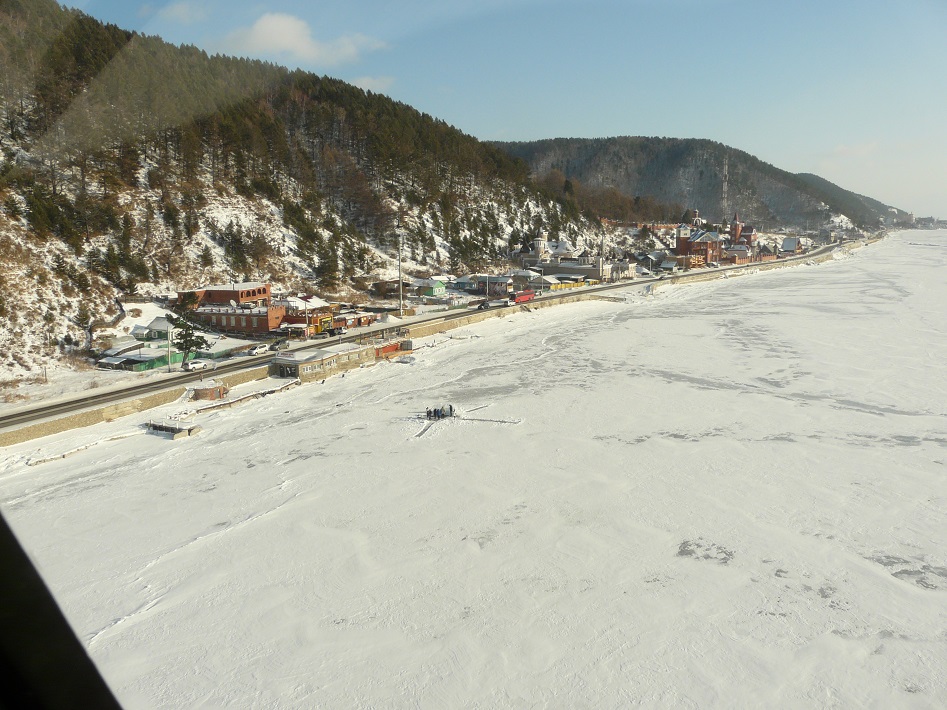Мы совершили посадку на берегу озера рядом с посёлком Листвянка. Это крайний населённый пункт на Северном берегу озера. Дальше дороги нет. Листвянка является крупным туристическим центром. Сюда приезжают из Иркутска на машинах. Тут много всяких развлечений.