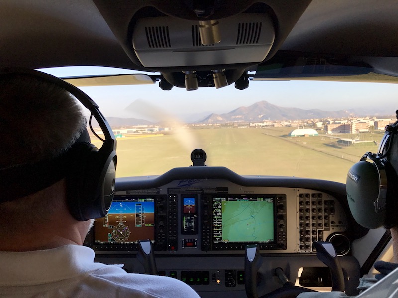 Вволю налюбовавшись древней архитектурой с высоты птичьего полета, сделав фото, беру курс к заводскому аэродрому. Лоренцио предлагает выполнить несколько “тач энд гоу”, конечно с удовольствием соглашаюсь. Интересно – ограничение скорости по всем положениям закрылков одно – 91 узел. Заход выполняю с закрылками, выпущенными во взлетное положение. Скорость на прямой – 76 узлов. Первое касание с перелетиком – самолет даже при полной уборке газа оказывается очень летучим, даже при четырех на борту. Исправим!