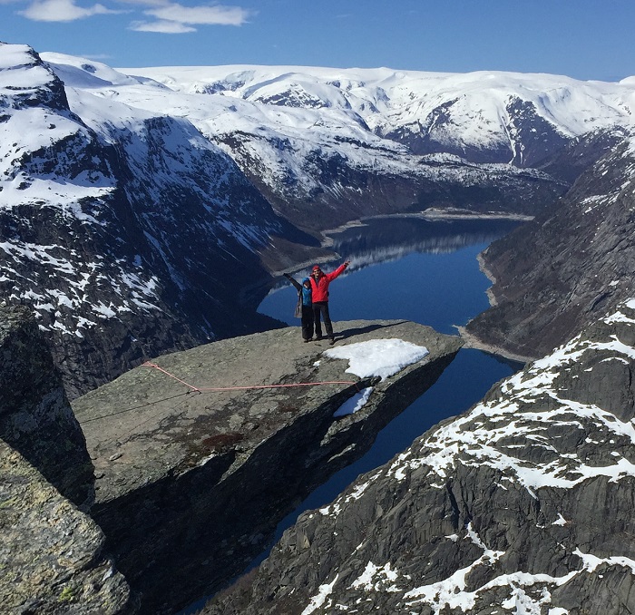 И опять – фьорды! И – Язык Тролля! По-честному! Мы знали, что люди пешком идут к нему 7-8 часов. Поэтому мы просто подлетели к хребту и увидели людей, медленно топающих по тропинке на снегу. Мы приземлились в 100 м от Языка и сделали, наконец, те кадры, ради которых летели.
