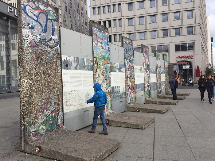Мы приехали на такси на Potsdamer Platz, откуда должны были уехать на пригородной электричке до Шёнхагена. Электричка должна была отправиться через час, поэтому мы взяли билеты и вышли из зала метро наверх погреться и побродить по площади. Вот он – фрагмент Берлинской стены, сохраненный немцами как мемориал. На нем – рассказ о строительстве и разрушении, сравнительные фото мест со стеной и после ее сноса. И через весь город идет след от стены как напоминание, как политика может разлучить семьи и народ.