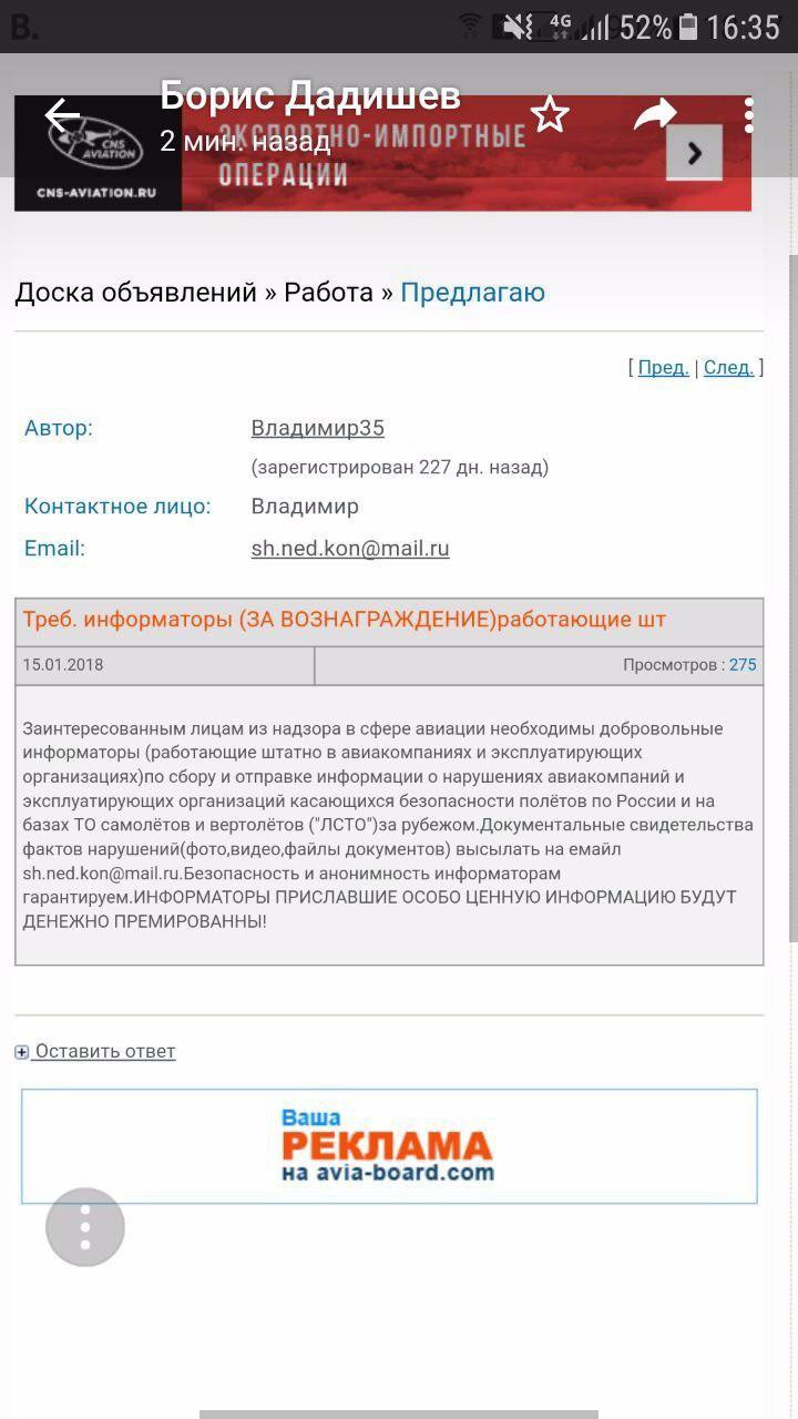 Кто-нибудь слышал про официальный набор стукачей в авиации?