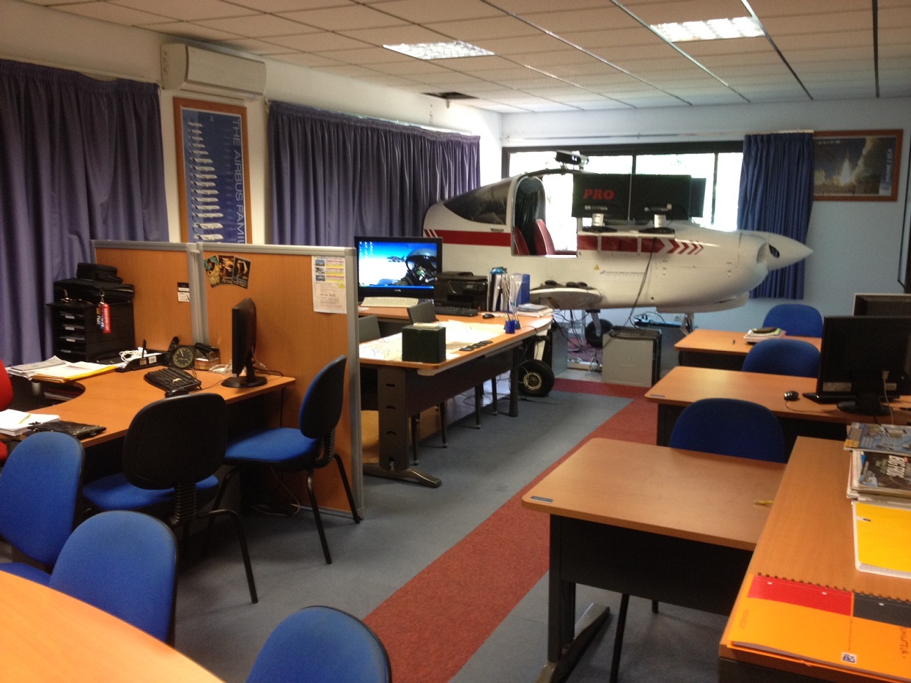 На фото (выше) вы видите наш класс , в школе есть правило- пока не сдал теорию, практически не подходишь к самолету , поэтому в этом классе учащиеся проводят много времени , проводятся занятия , и самоподготовка т.е. вы можете пользоваться классом без лимита приходить в 9:00 и уходить в 18:00,пользоваться также симулятором без лимита , столько сколько вам будет нужно пока вы не отточите свои навыки (очень полезно!) Также и с теорией никто вас не гонит ,занимаетесь в своем ритме нет никакого давления ,если не поняли вам объяснят столько сколько нужно вам ! Также вы не лимитированы по времени ,конечно 5 лет Вас никто держать не будет , но я видел ребят которые прошли программу за 2 года,я имею ввиду человек приходил и занимался когда хотел и получил свой PPL спокойно, видел парня который прошел все за 5 месяцев,а директор школы сказал мне, что могут сделать ускоренный курс заточенный под конкретного ученика рассчитанный на 3 месяца. В школу приходят люди всех возрастов например сейчас со мной учится мужчина которому 70 лет (прошел мед.комиссию №2),есть и ребята от 14-15 лет (учатся в своем ритме и как я понимаю по своей программе так как первый полет соло в школе от 16 лет а сдача экзаменов с 17лет,но учатся и теорию знают очень хорошо ).