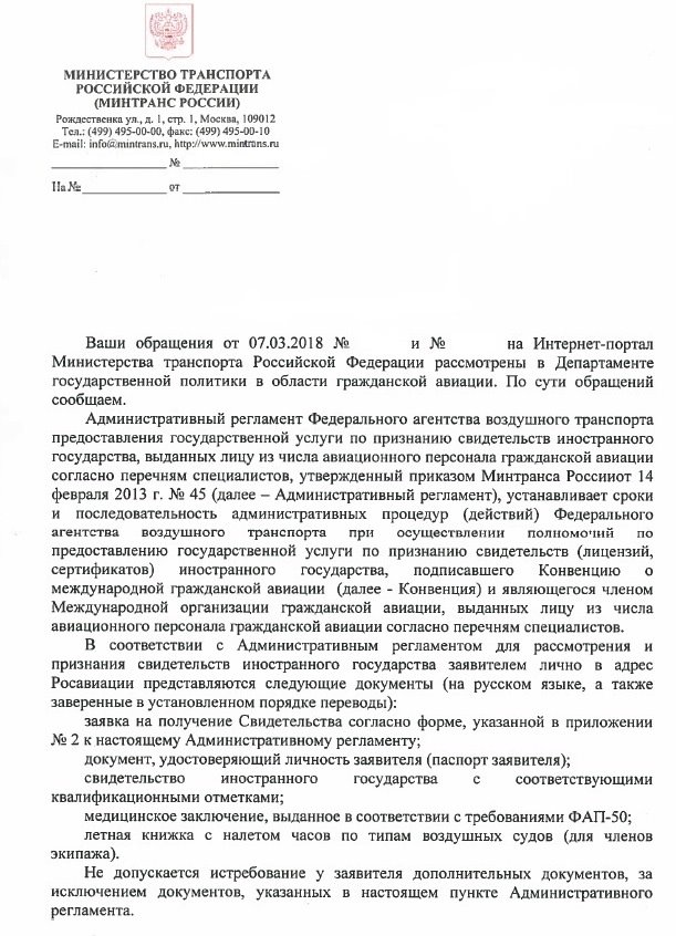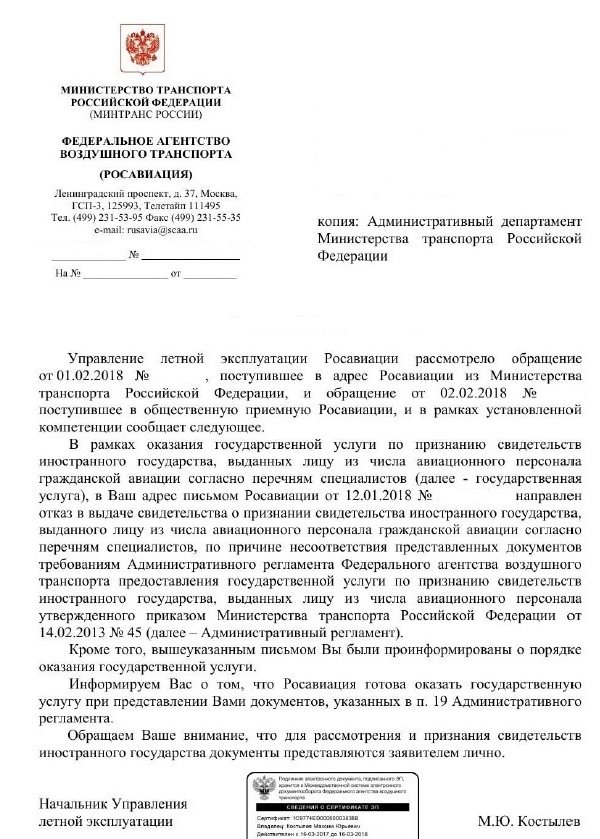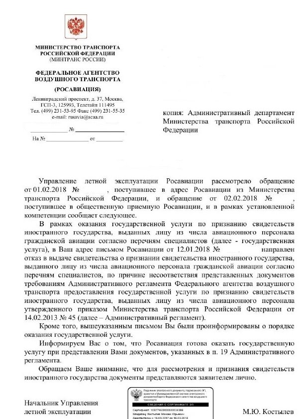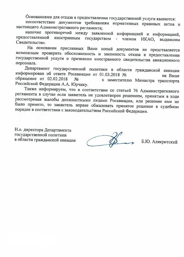 В связи с окончанием в конце апреля европейской валидации было решено ревалидировать класс рейтинг европейской лицензии и подавать заново, что я и сделал, получив все требуемые еасовские отметки в лицензию в начале мая. Дополнительно приложил оригинал подтверждения с нотариальным переводом. Буду надеяться, что здравый смысл возобладает и всё-таки будет получена валидация. И в ином случае, решение вопроса будет переведено в плоскость судебного разбирательства.