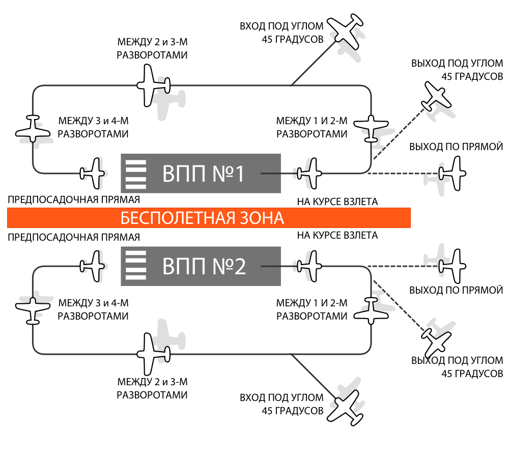 Схема захода на параллельные ВПП на неконтролируемых аэродромах: