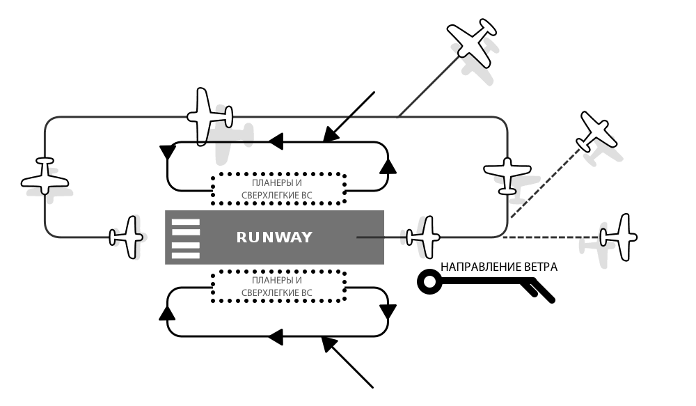 Сверхлегкие воздушные суда должны соблюдать прямоугольную схему полетов по кругу, как представлено на схеме выше. Высота полета по аэродромному кругу должна составлять на 150 метров (500 футов) ниже стандартной высоты, установленной для полетов по кругу для обычных ВС и расположена внутри нормальной схемы.