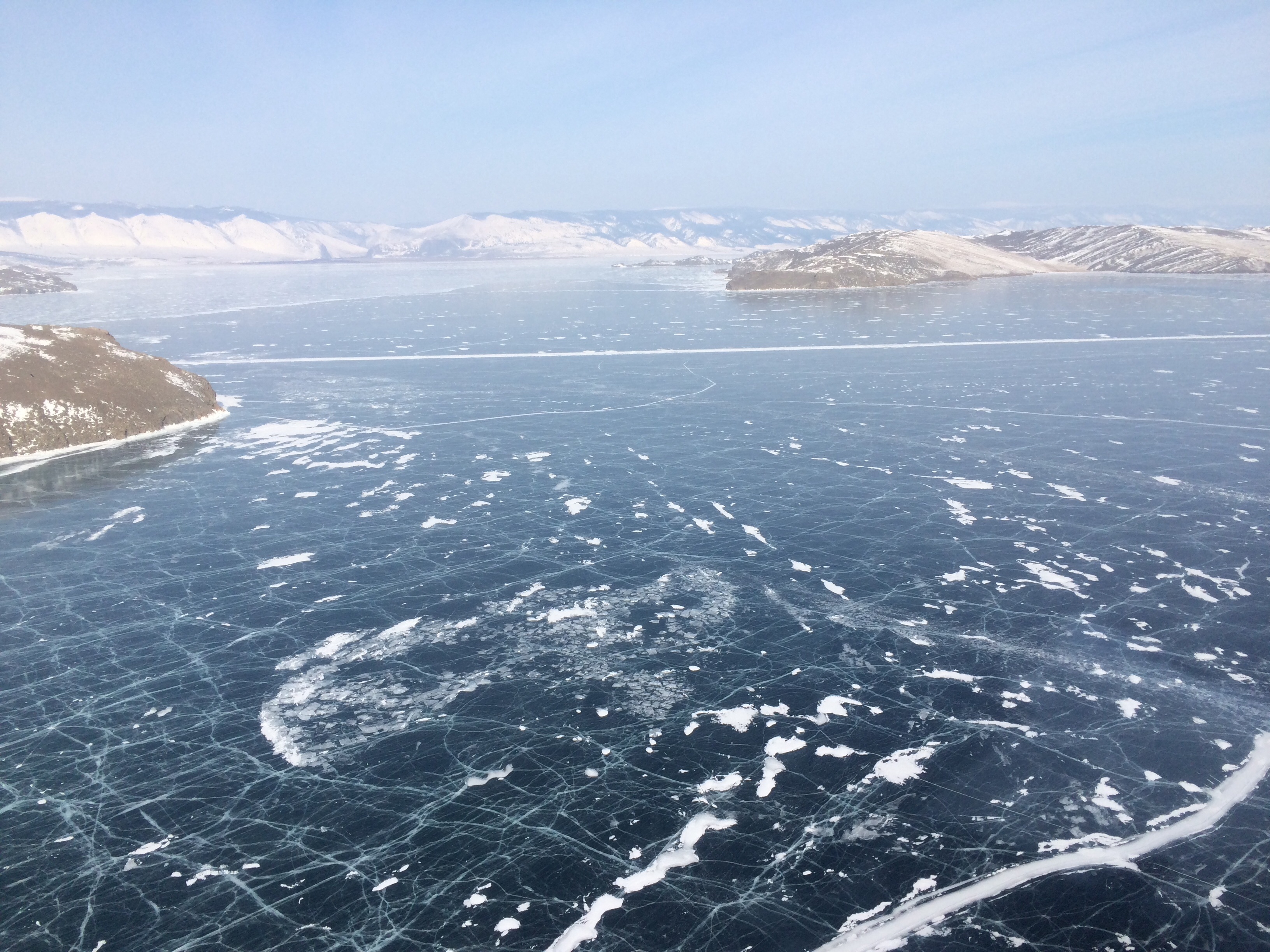 Салон замолк мы лавируем между сопок выскакиваем в тажеранскую долину. Уважаемые пассажиры можно расслабиться. Тут и солнышко выглянуло. И так посмотрите налево там вы видите памятник орлам, посмотрите вправо там в Байкал впадает река Анга. Мы замолкаем они пишут чистый звук. Регина просто кричит в гарнитуру от увиденного. Ныряем вниз к земле и выскакиваем на лёд.