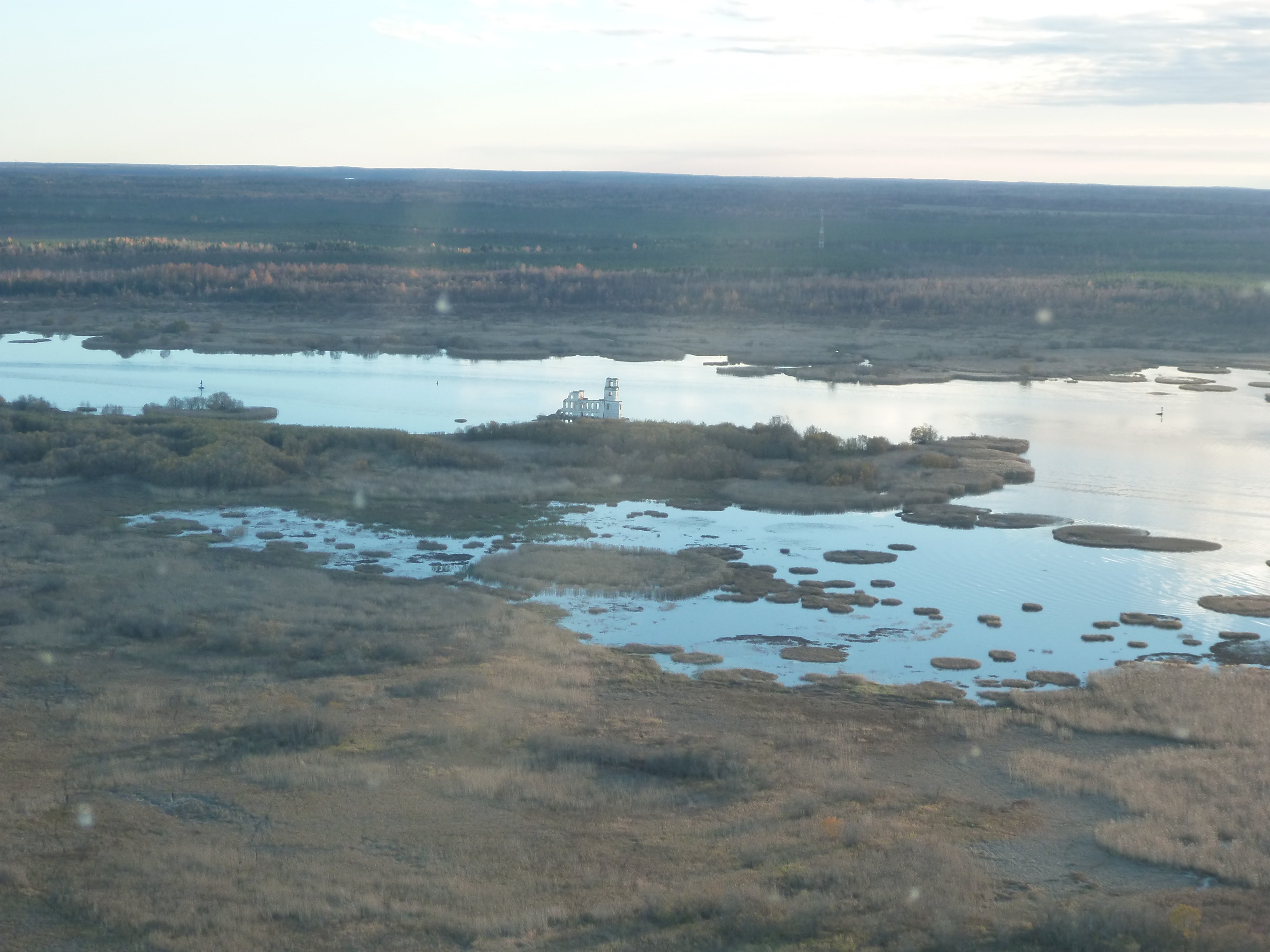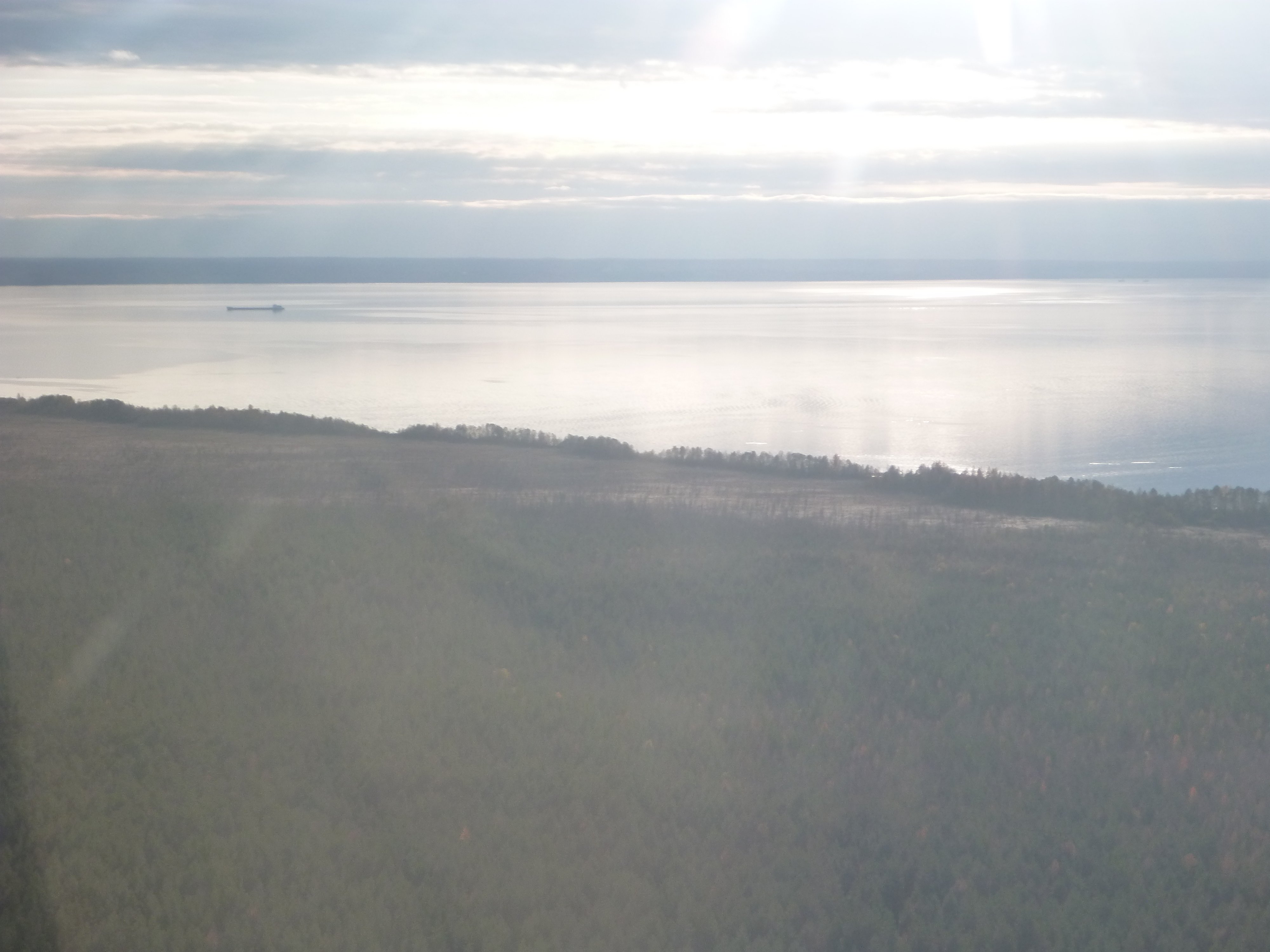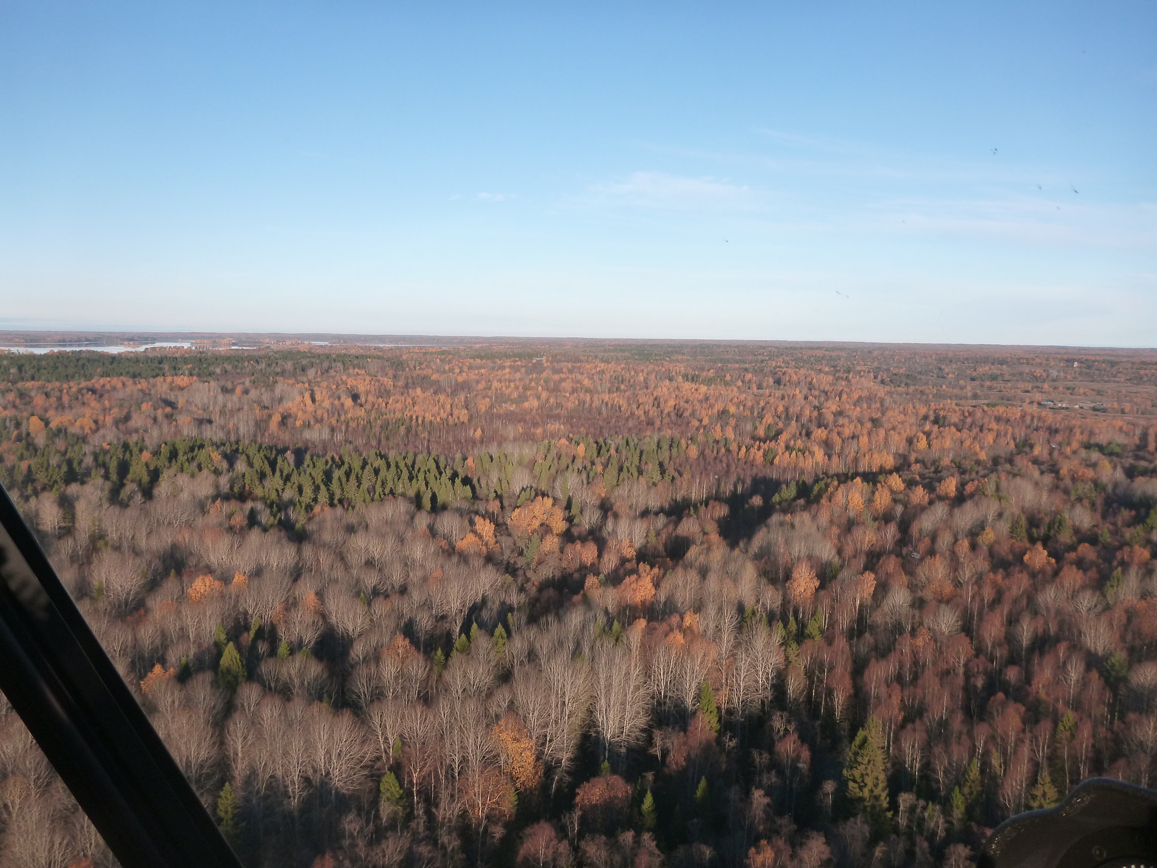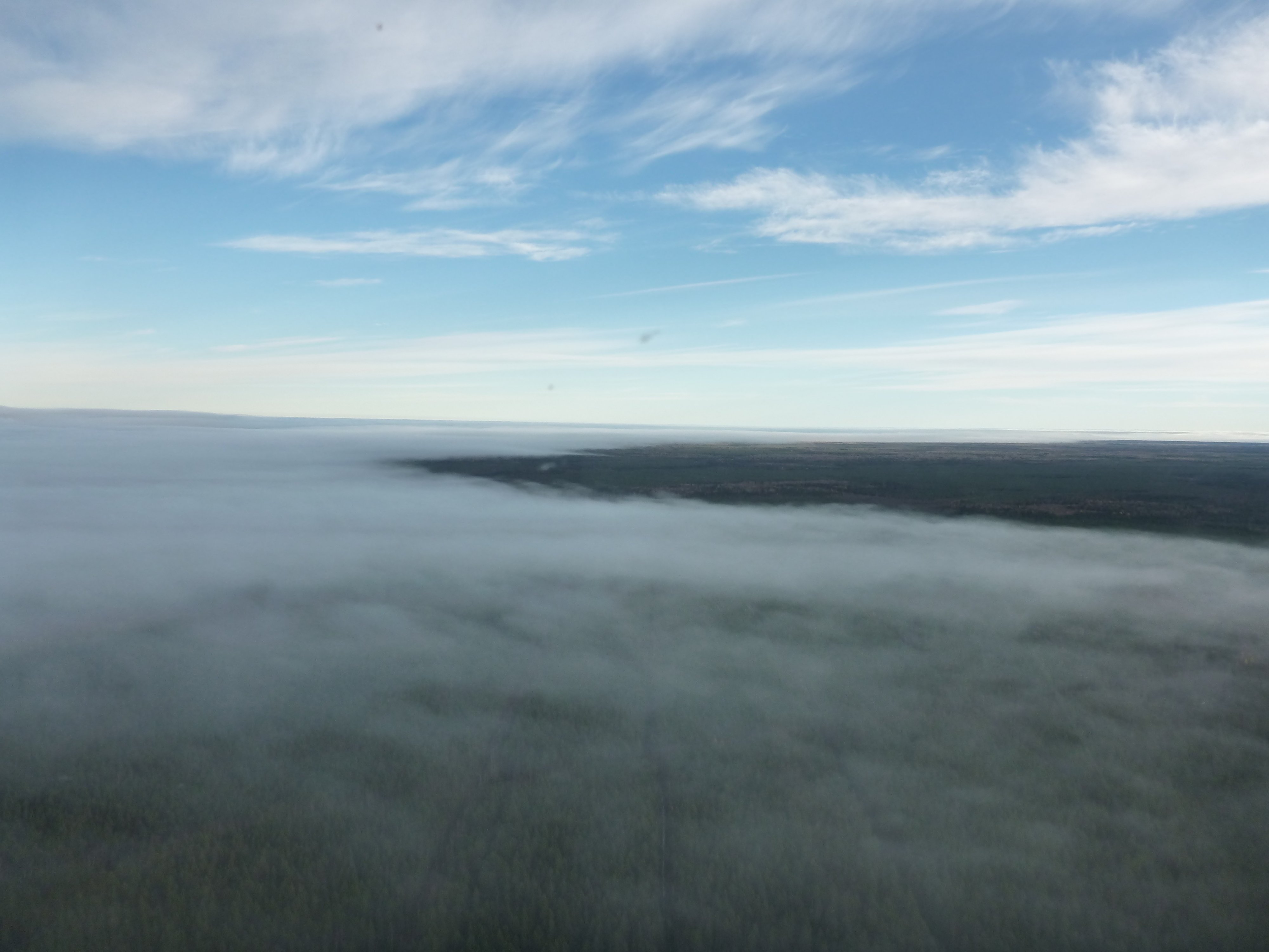 Подушка лежала на деревьях. Мы поднялись выше и летели высматривая дырки и рассчитывая время-топливо для возврата к одной из них, чтоб подсесть и перелить канистры в бак. До озера оставалось всего 40 км и мы увидели как верхняя кромка начала подниматься. Облачный слой был не толстый, но прошивать его не зная нижней кромки глупо. Мы разглядели одну дырку и нырнули в неё для посадки. Под дыркой оказалось озерцо