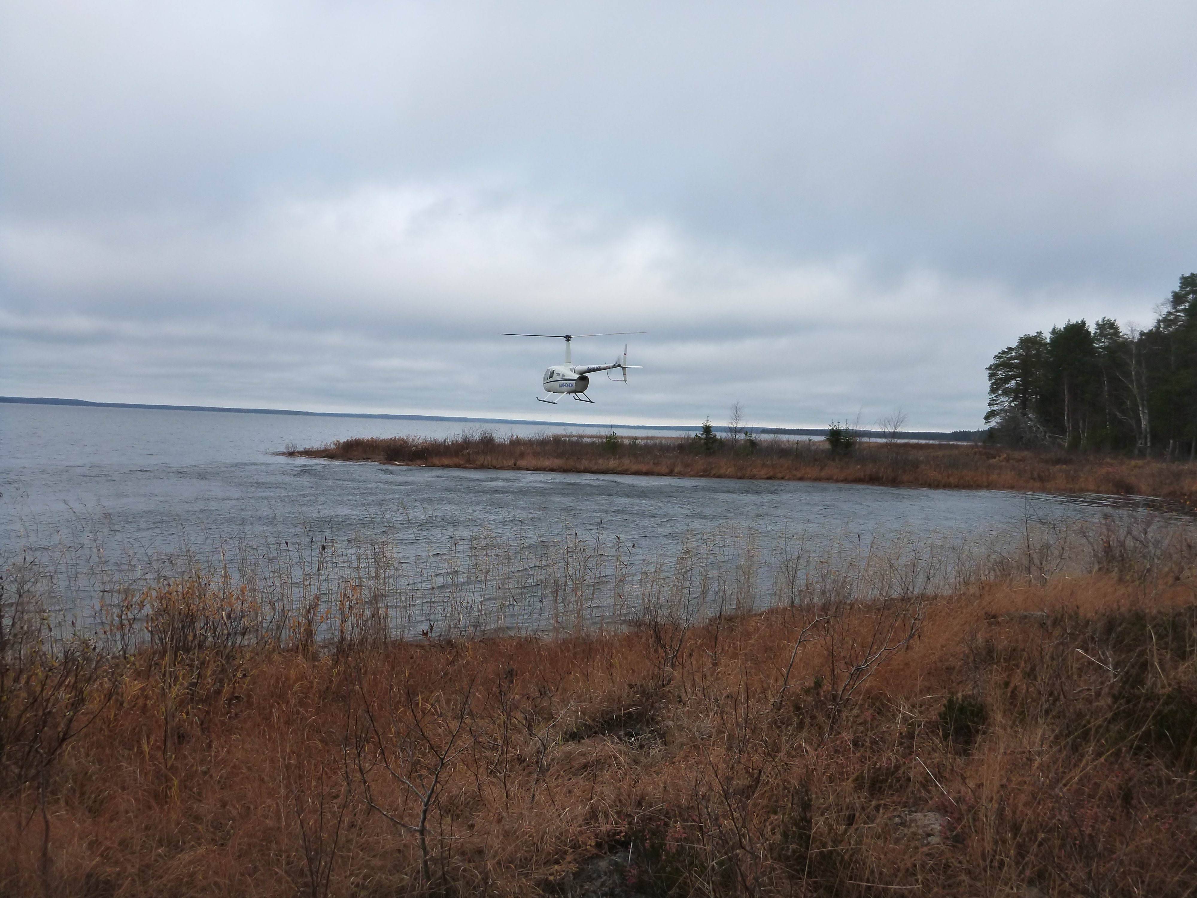 Озерцо с лебедями и двумя мужиками в лодке, которые проверяли сети. Увидев вертолёт кружащий над озером они смотались пока ещё винт после выключения не остановился. Нет, чтоб подплыть и предложить помощь какую! :) Облака плотно лежали на лесе и нам ничего не оставалось делать, как закинуть удочки и спининги. На поплавочную удочку бойко клевала плотва удивительной красоты. Всю отпустили. Через 40 минут небо поднялось и мы двинули дальше.Вот и моё любимое озеро!