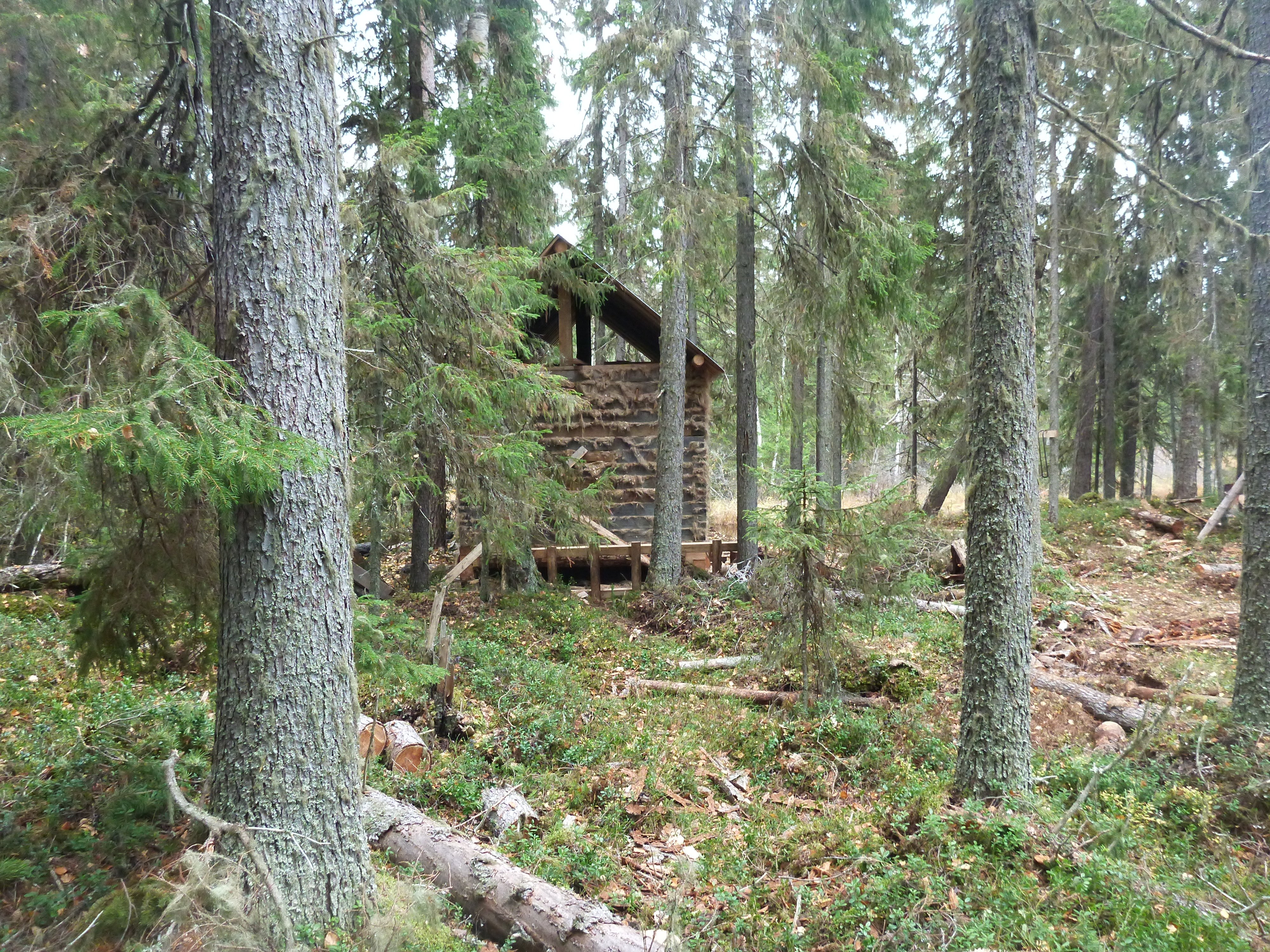 Если кто помнит, я рассказывал, что на берег, рядом с нашим схроном с снастями, зимой был завезён полуфабикат избушки. Так вот её уже почти построили.