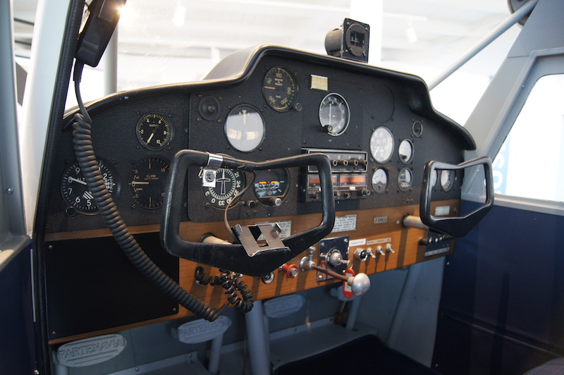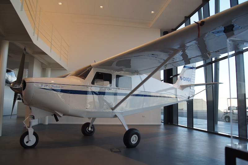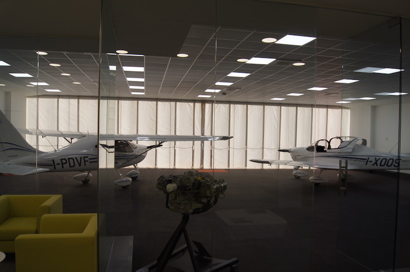 За воротами огромный парадный фасад из тонированного стекла и металла. Профилированные колонны-подкосы – авиация! Красота. Огромный холл с бездонным потолком до неба со стойкой администратора и… настоящей половинкой «твенти тена»! Итальянцы встречают нас очень тепло и, глядя на наше удивление, шутят: «Клиенту хватило денег только на половину самолета, вторую повесили здесь!» Из огромного холла попадаем в настоящий музей, где нас встречает старенький но живой Р57 Fachiro. От роду ему наверное лет полста, при этом старичок отлично сохранился благодаря бережному отношению любящих и помнящих Историю хороших людей. Он четырехместный и с тремя дверями! Внутри кабины царство 60-х и запах.. Самолета.