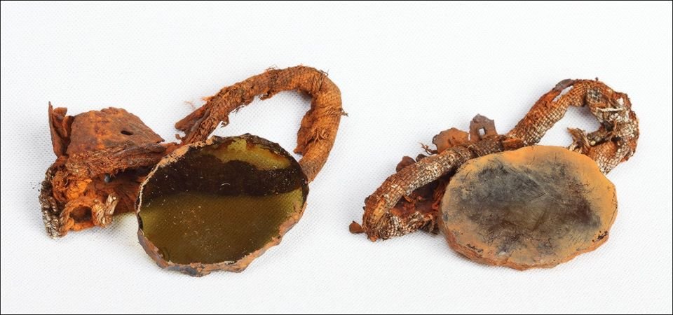 Когда начали разбирать камни на вершине морены над местом обнаружения останков человека и там, где лежал нож, то сразу обнаружили что-то непонятное. Некоторое время не решались трогать, пытаясь понять, что же мы нашли: два овальных стёклышка, явно бутылочные, края неровные, тряпочки какие-то сбоку, веревочки и жестянки хрупкие с дырочками, пробитые гвоздиками. Аккуратно выскребаем, вытаиваем всё это из мерзлоты между обломков базальта, гадая чем это может быть.