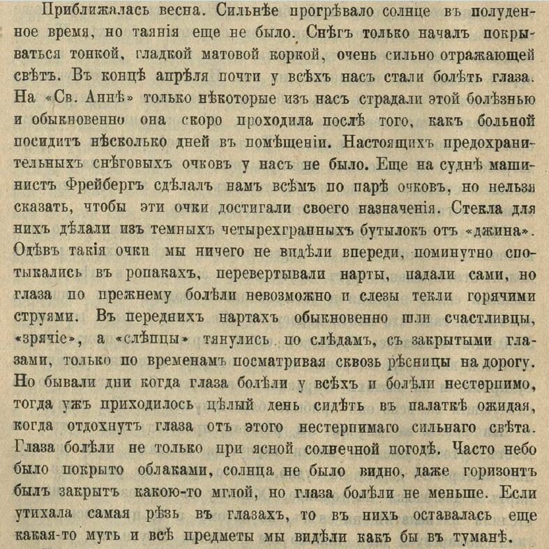 И тут вспомнился отрывок из книги-дневника «На юг, к Земле Франца-Иосифа», где Альбанов описывает, как машинист Фрейберг в темном трюме мастерил солнцезащитные очки из бутылочного стекла, а из жестяных банок и парусины, наверное, изготавливал оправу.