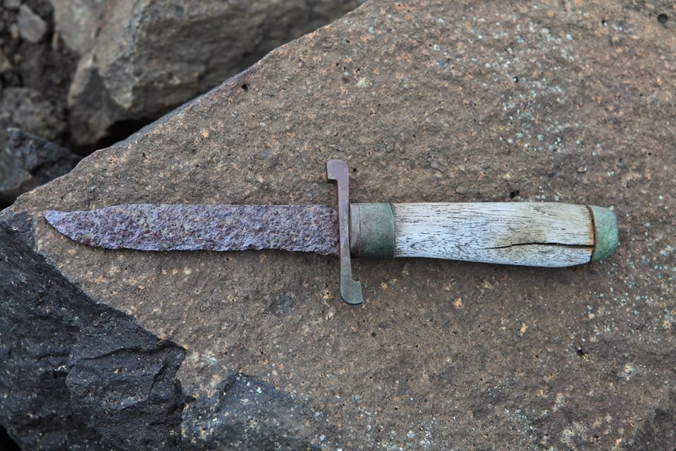 Помню, что в начале работ решил снять общий вид сверху. Карабкаюсь по сыпучему склону морены, выхожу на гребень, выбирая ракурс и… буквально спотыкаюсь о него. Даже рефлекторно оглянулся вокруг в поисках хозяина. Было ощущение, что его только что, а не столетие назад, положили на камень, человек где-то поблизости и сейчас подойдет. Нож, как компас, острием указывал на место, где между базальтовых глыб, вмороженные в лёд, лежали кости его хозяина.