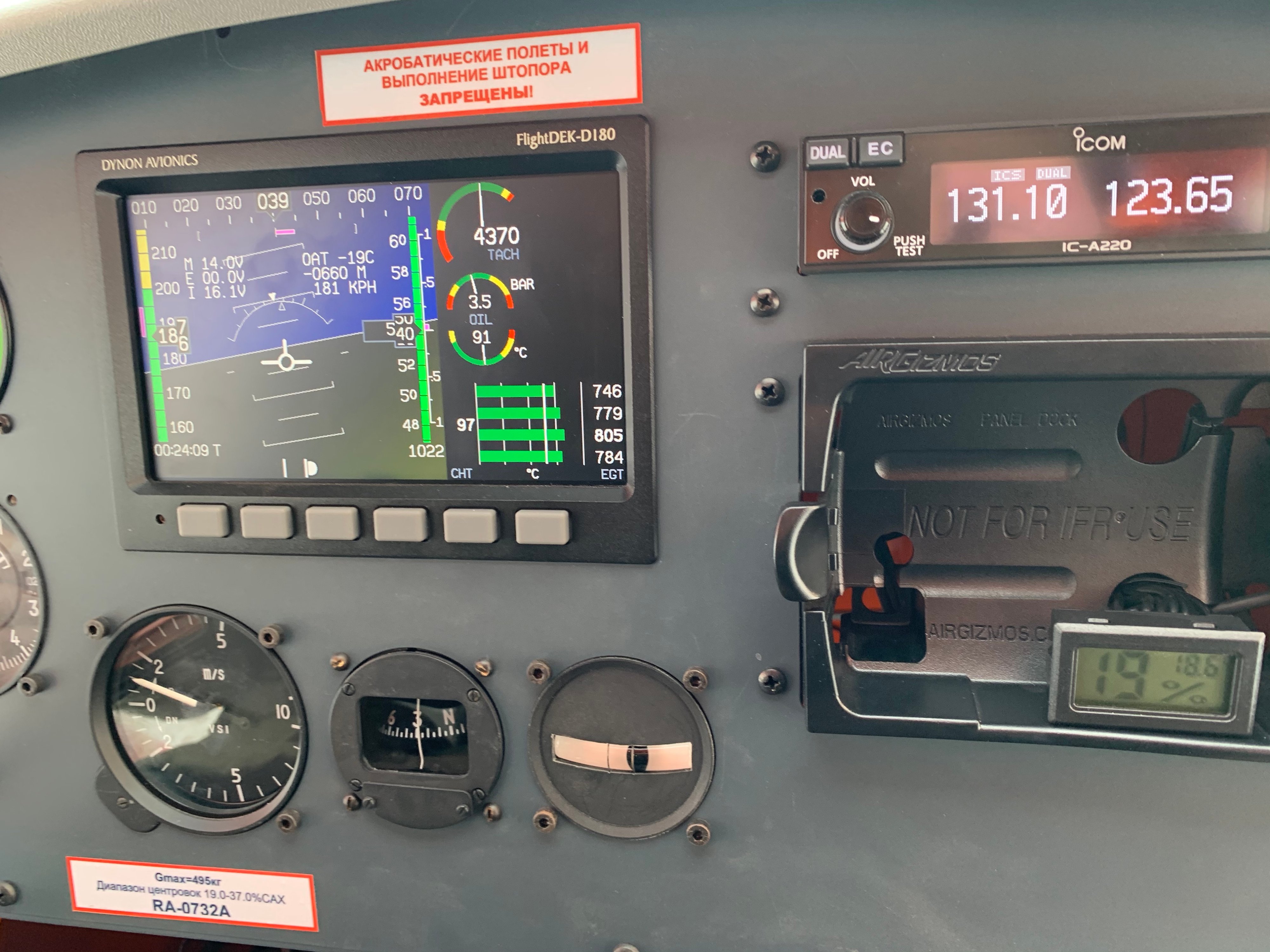 По авионике было принято решение об установке Dynon D-180, взамен снятого с производства D-6, и хорошо себя зарекомендовавшего FlyDat, в комплексе с механическими дублерами - указателем скорости, вариометром и высотомером.