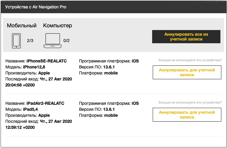 Зайдите в свою учетную запись на сайте airnavigation.aero и убедитесь, что количество устройств, на которые разрешено устанавливать Airnavigation Pro, не исчерпано (см. скриншот моей учетной записи). Если У вас нет свободных слотов, то "убейте" ненужные привязки, нажав напротив ненужных устройств на кнопку "Аннулировать для учетной записи". Подождите несколько минту (а иногда приходится и несколько часов), пока система сбросит привязку, а затем попробуйте выйти и снова зайти под своей учетной записью на планшете. далее - повторите попытку восстановления.vinogradov писал(а): ↑31 авг 2020, 16:04 Подскажите есть ли возможность и как восстановить покупки на другом устройстве? На айфоне есть карты, на айпаде не получается их загрузить восстановлением. Учетная запись апстор одна. Спасибо.